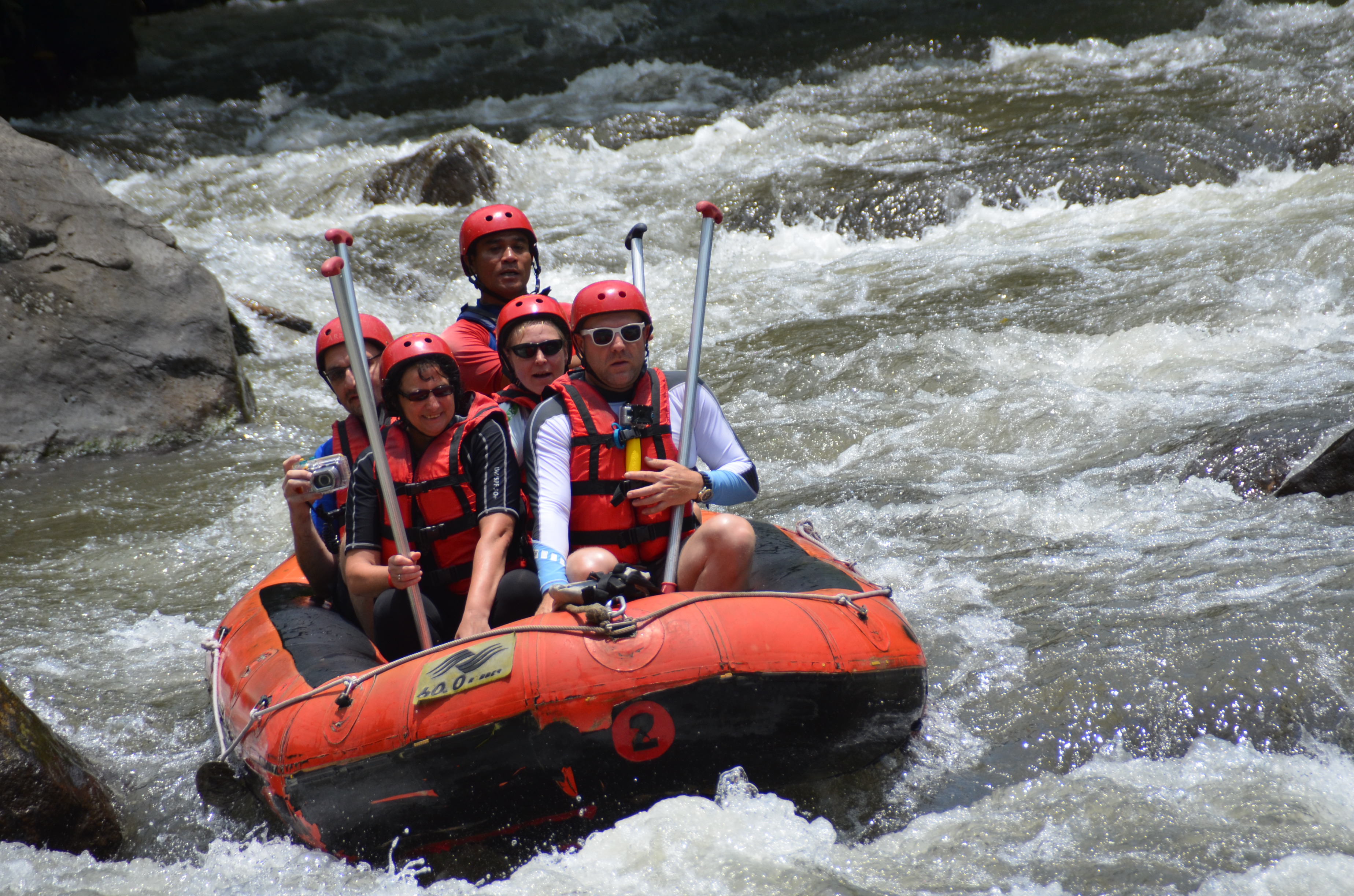 Um 8:30 Uhr wurden wir heute Morgen nach dem Frühstück in dem benachbarten Kaffee des Adhi Cottage abgeholt. Nach 45 Minuten Autofahrt kamen wir am Startpunkt unserer Rafting Tour an und wurden gleich mit Schwimmweste und Helm ausgestattet. Nach kurzer Einweisung ging es dann mit unserem Bootsführer zu fünft auf die zweistündige Tour. Es hat allen viel Spaß gemacht und das Bad im Fluss war sehr erfrischend. Am Endpunkt konnte man sich auch gleich duschen und es gab ein warmes Mittagessen. Abends waren wir dann wieder im Sagitarius Restaurant nur etwas links die Straße runter. Hier ist das Essen sehr lecker und der Koch versteht sein Handwerk was sich auch in den mit frisch gepressten Obst zubereiteten Cocktails bemerkbar macht.