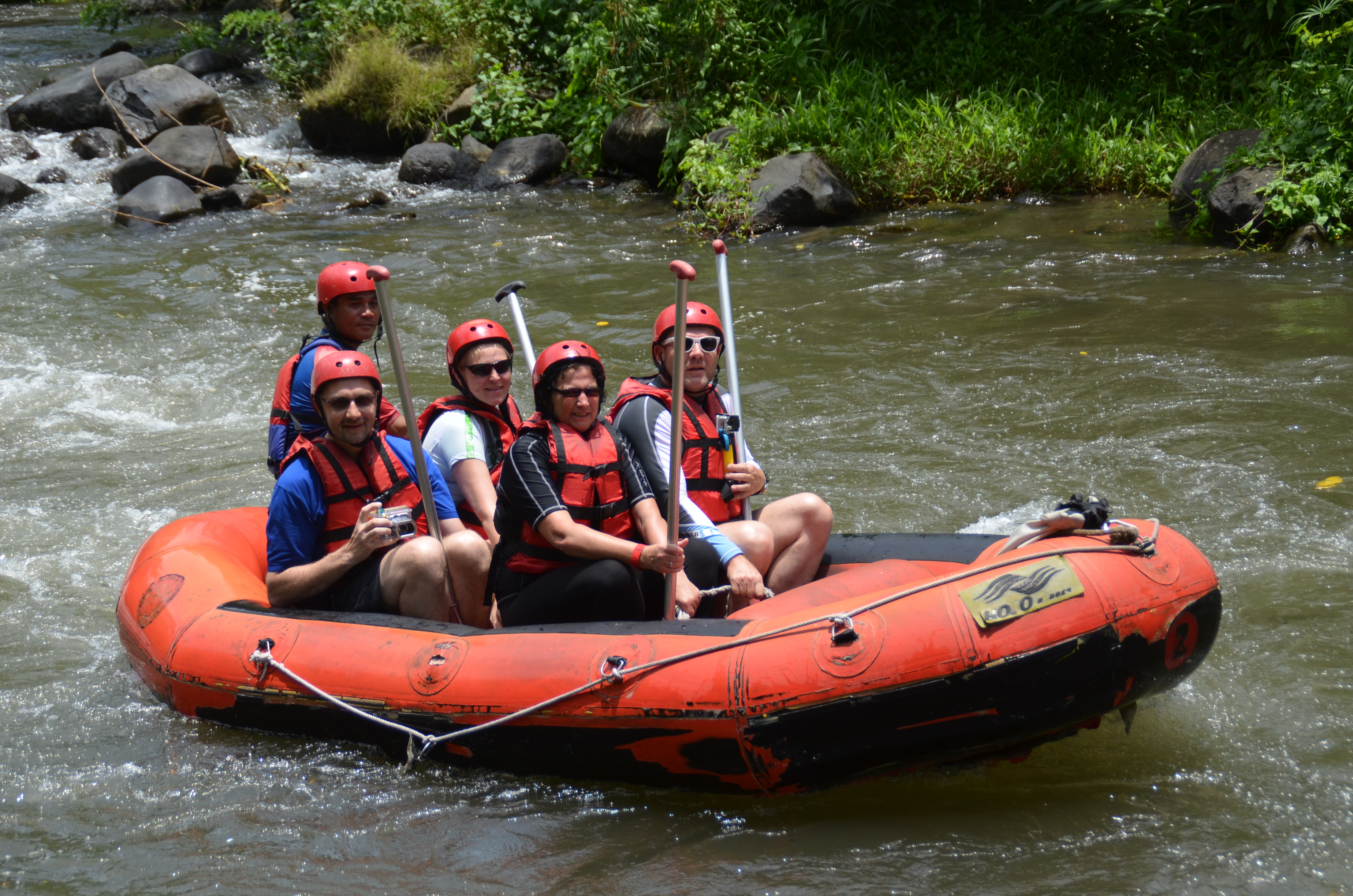 Um 8:30 Uhr wurden wir heute Morgen nach dem Frühstück in dem benachbarten Kaffee des Adhi Cottage abgeholt. Nach 45 Minuten Autofahrt kamen wir am Startpunkt unserer Rafting Tour an und wurden gleich mit Schwimmweste und Helm ausgestattet. Nach kurzer Einweisung ging es dann mit unserem Bootsführer zu fünft auf die zweistündige Tour. Es hat allen viel Spaß gemacht und das Bad im Fluss war sehr erfrischend. Am Endpunkt konnte man sich auch gleich duschen und es gab ein warmes Mittagessen. Abends waren wir dann wieder im Sagitarius Restaurant nur etwas links die Straße runter. Hier ist das Essen sehr lecker und der Koch versteht sein Handwerk was sich auch in den mit frisch gepressten Obst zubereiteten Cocktails bemerkbar macht.