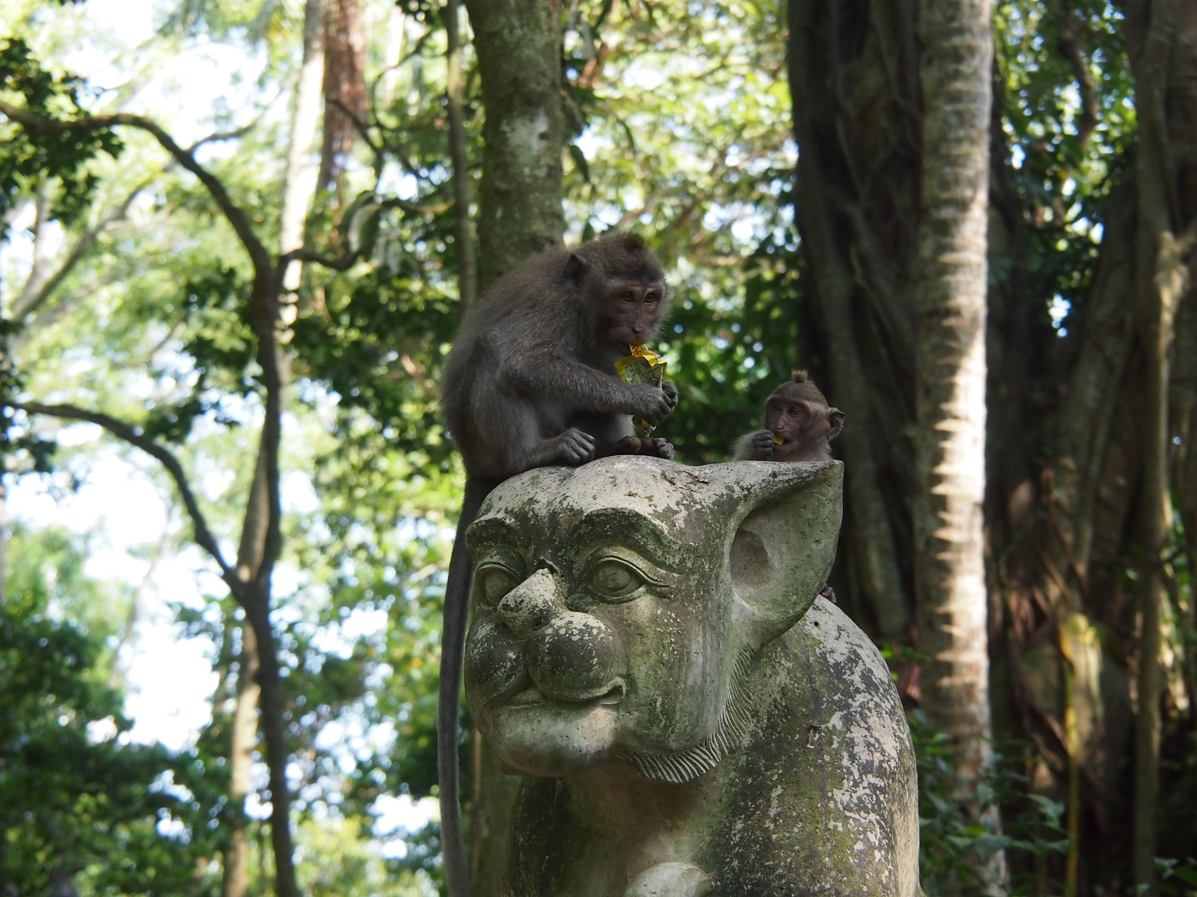 Um 09:00 Uhr ging heute Morgen unsere Rundreise mit der Fahrt zurück nach Sanur weiter. Als erstes sind wir in den Affenwald gefahren. Dort kann man wunderschön beobachten wie die Makaken durch die Bäume und über die Statuen klettern. Auch ein riesiger Ficus Benjamin mit Luftwurzeln über 30 m im Durchmesser verteilt haben wir dort bestaunt. Danach ging es weiter zu einer wunderschön im Hang gelegen Reis-Terrasse. Sehr interessant war auch ein Besuch in einem kleinen Gewürz und Kaffeehandel. Wir sahen die verschiedenen Bäume und Früchte welche hier wachsen. Auch konnten wir die verschiedenen Stufen der Kaffeeherstellung beobachten. Einschließlich der Mungos welche die Kaffeebohnen fressen und dann wieder ausscheiden was dann den berühmten Luwak Kaffee ergibt. All diese verschiedenen Sorten konnten wir hier probieren. Nach dem Mittagessen sind wir dann noch in eine Holzschnitzerei gefahren wo Peter sich einen Barong und Claudia sich einen Elefanten erhandelt haben. Auf speziellen Wunsch von Peter ging es dann noch zum Harley Händler bevor wir unser ausgewaschenes und getrocknetes Tauchgepäck in der Ena Tauchbasis in Empfang nehmen konnten. Dort haben wir dann den einen zusätzlichen Tauchtag bezahlt und bekamen eine landestypische Schnitzerei mit unserem Namen geschenkt. Angekommen im Puri Mesari Hotel haben wir die letzte Gelegenheit genutzt uns nochmal eine Massage zu gönnen und haben dann auch im Hotel lecker zu Abend gegessen.