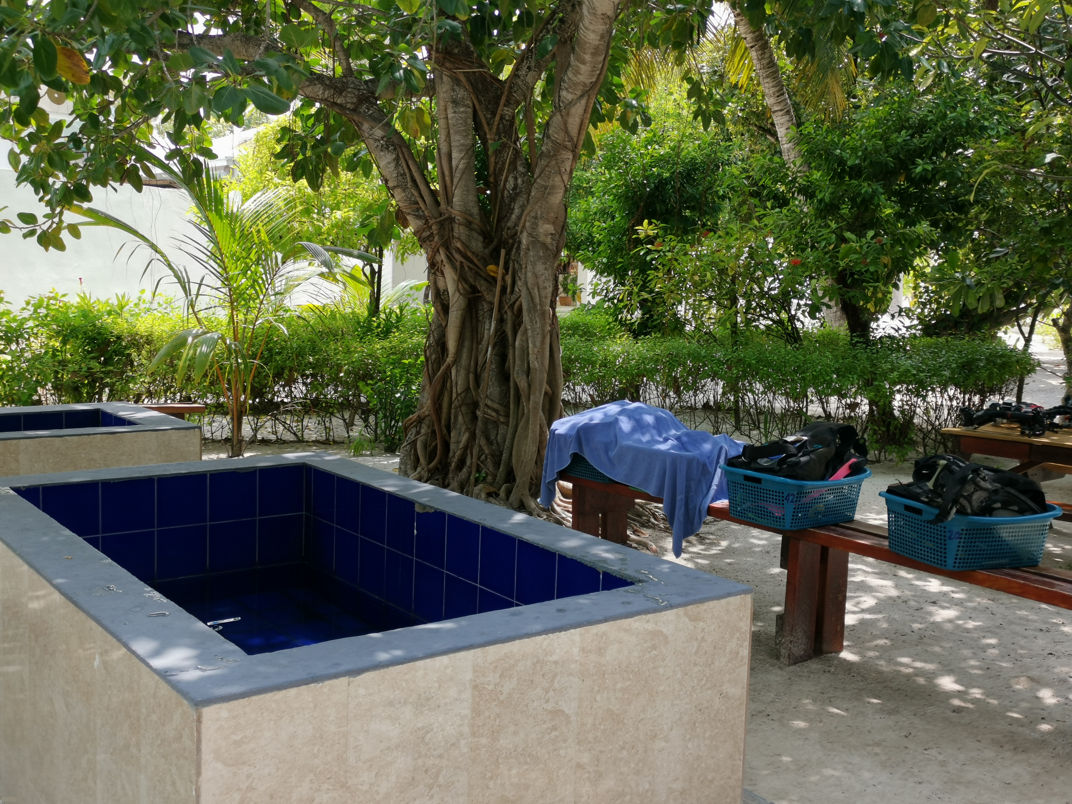 Am Vormittag war ich mit Peter am Fish Head wo wir sehr große Schwärme an Fischen und entsprechend viele Haie beobachten konnten. Nachmittags waren wir dann zu viert nur 5 Minuten entfernt am Bathala Thila wo das Riff noch deutlich besser ist.