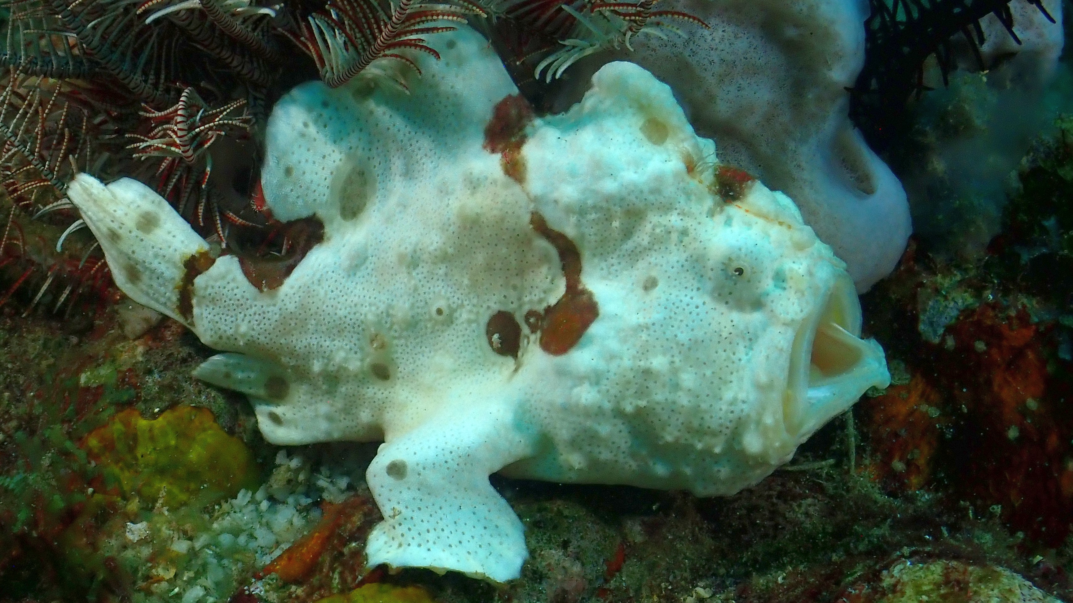 Nach dem Faulenzen gestern waren wir heute erst an einer schönen Steilwand mit vielen Hart und Weichkorallen. Beim zweiten Tauchgang haben wir dann einen schönen weißen Anglerfisch auf der Suche nach einem neuen Platz beobachtet. Das Highlight war dann aber neben dem farbenfrohen „Helm Flughahn“ der sehr giftige Blauring-Oktopus beim letzten Tauchgang.