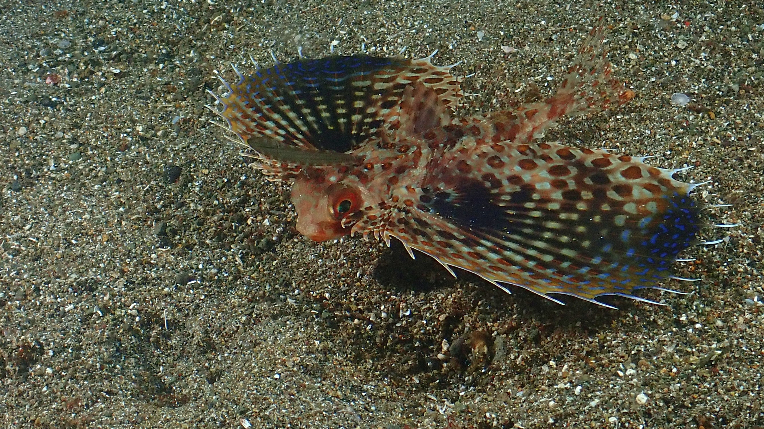 Nach dem Faulenzen gestern waren wir heute erst an einer schönen Steilwand mit vielen Hart und Weichkorallen. Beim zweiten Tauchgang haben wir dann einen schönen weißen Anglerfisch auf der Suche nach einem neuen Platz beobachtet. Das Highlight war dann aber neben dem farbenfrohen „Helm Flughahn“ der sehr giftige Blauring-Oktopus beim letzten Tauchgang.