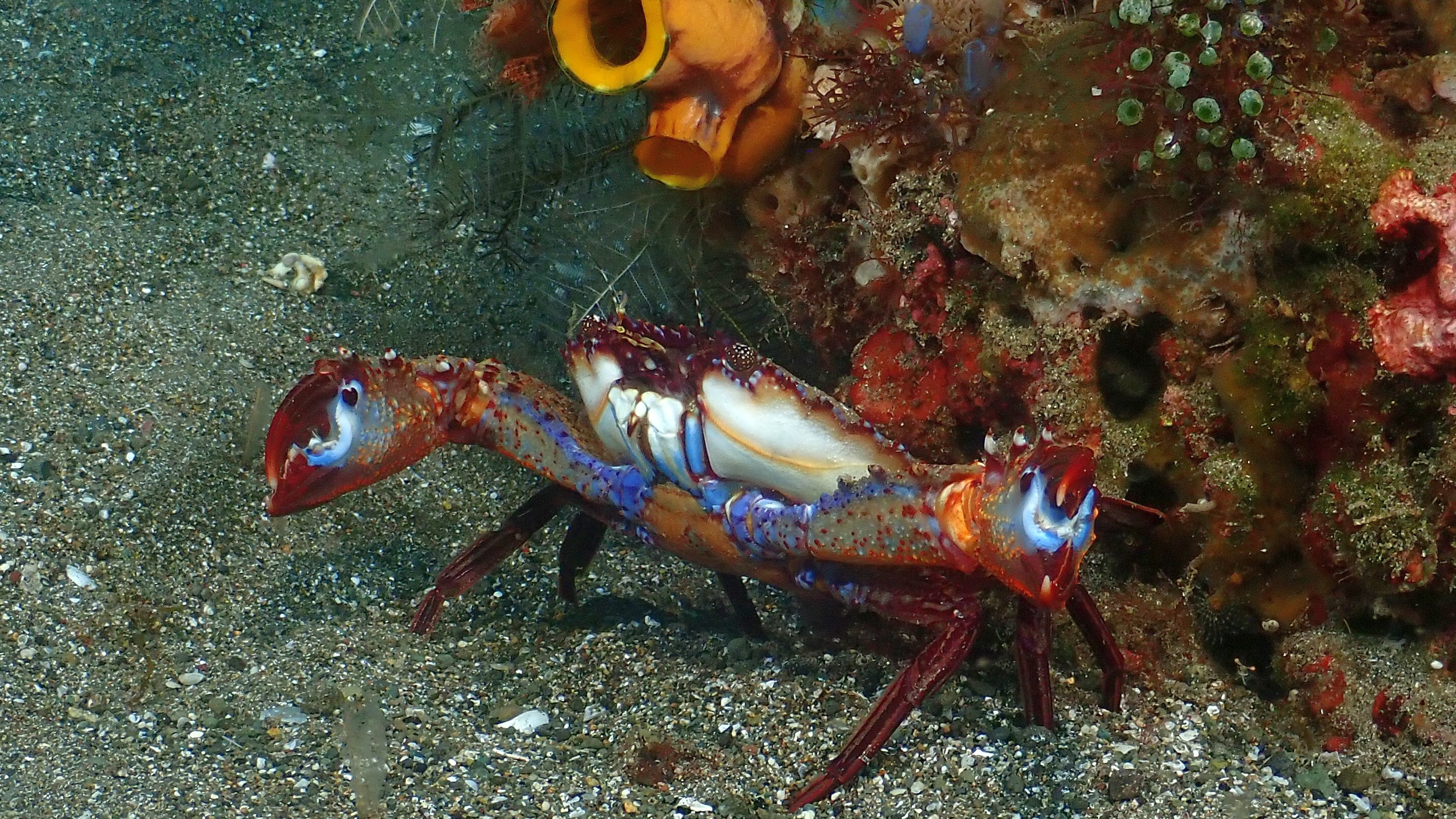 Nach dem Faulenzen gestern waren wir heute erst an einer schönen Steilwand mit vielen Hart und Weichkorallen. Beim zweiten Tauchgang haben wir dann einen schönen weißen Anglerfisch auf der Suche nach einem neuen Platz beobachtet. Das Highlight war dann aber neben dem farbenfrohen „Helm Flughahn“ der sehr giftige Blauring-Oktopus beim letzten Tauchgang.