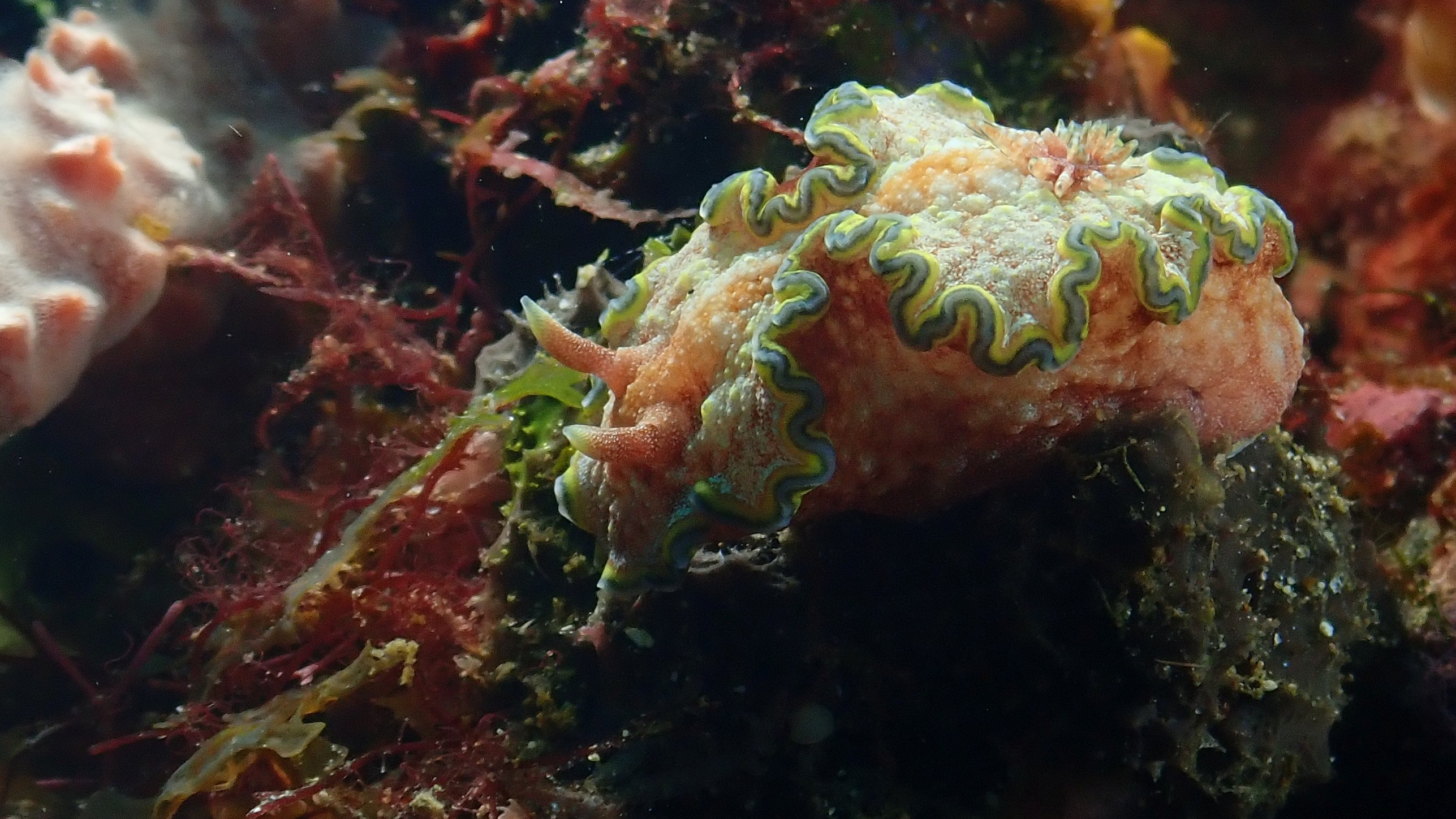 Heute konnten wir bei den Tauchgängen ein paar Meister der Tarnung erleben. Die "Mimikry Fadenschnecke" sieht aus wie eine Weichkoralle und der "Schmuck Geisterpfeifenfisch" wie ein Federstern. Wenn der "Seegras Geisterpfeifenfish" nachahmt, sagt ja schon der Name. Den lustigsten Namen hat die "Donald Duck Garnele". Am niedlichsten war aber der winzige rote Anglerfisch und die kleine "Flammende Sepia".