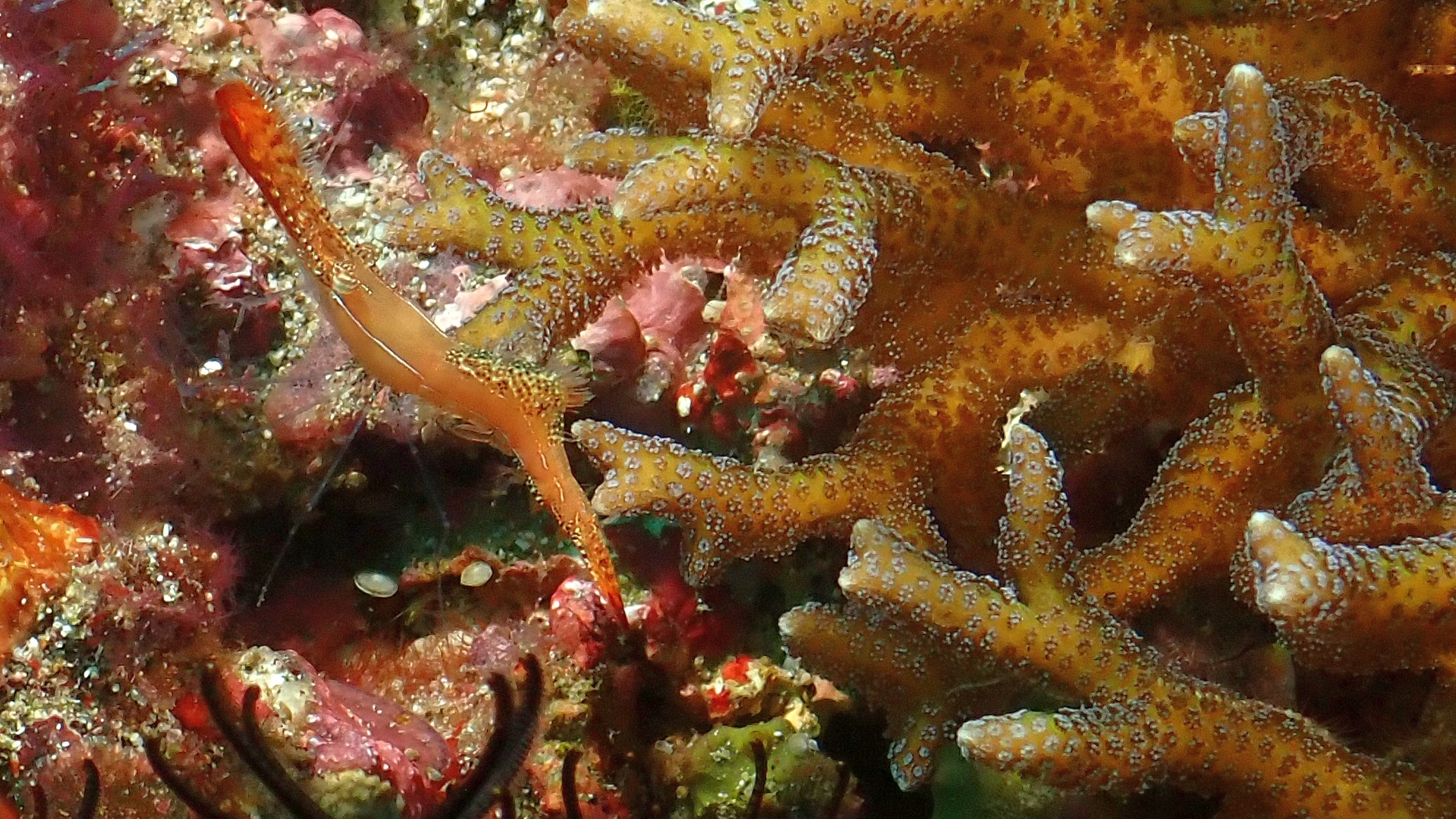 Heute konnten wir bei den Tauchgängen ein paar Meister der Tarnung erleben. Die "Mimikry Fadenschnecke" sieht aus wie eine Weichkoralle und der "Schmuck Geisterpfeifenfisch" wie ein Federstern. Wenn der "Seegras Geisterpfeifenfish" nachahmt, sagt ja schon der Name. Den lustigsten Namen hat die "Donald Duck Garnele". Am niedlichsten war aber der winzige rote Anglerfisch und die kleine "Flammende Sepia".