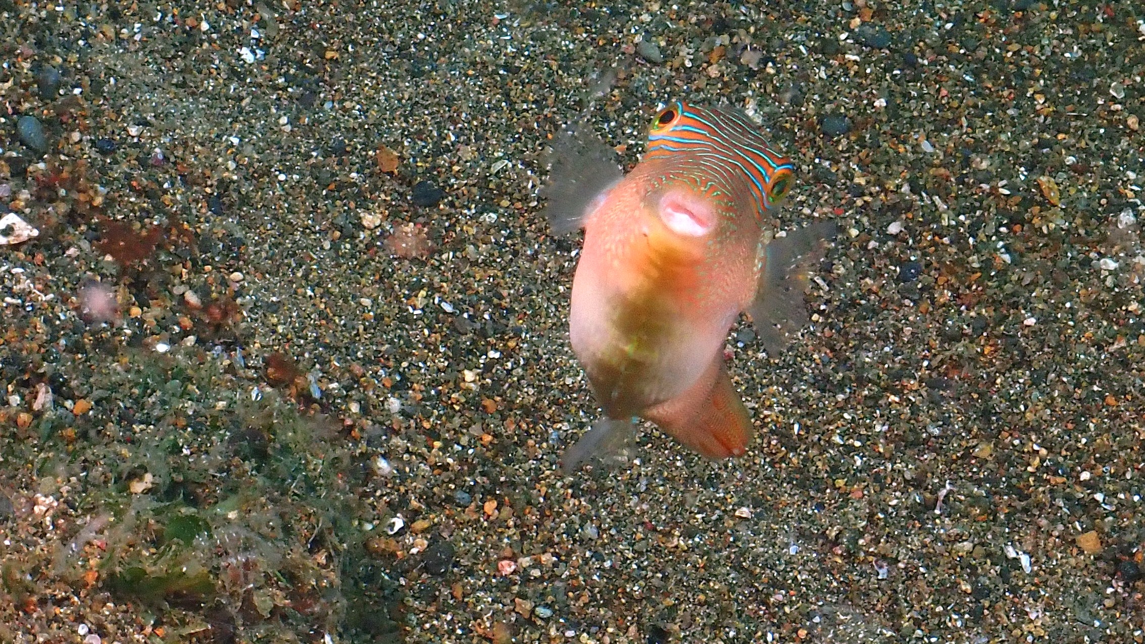 Beim ersten Tauchgang haben wir neben Krabben und Garnelen auf Seesternen wieder einen roten Anglerfisch gesehen. Während des austauchens kam dann ein Sandaal herausgekrochen. Beim zweiten Tauchgang waren die Highlights eine "Orang-Utan-Krabbe" auf dem Sand, 2 "Schmuck Geisterpfeifenfische" vor einem Federstern und vor allem die "Flammende Sepia".