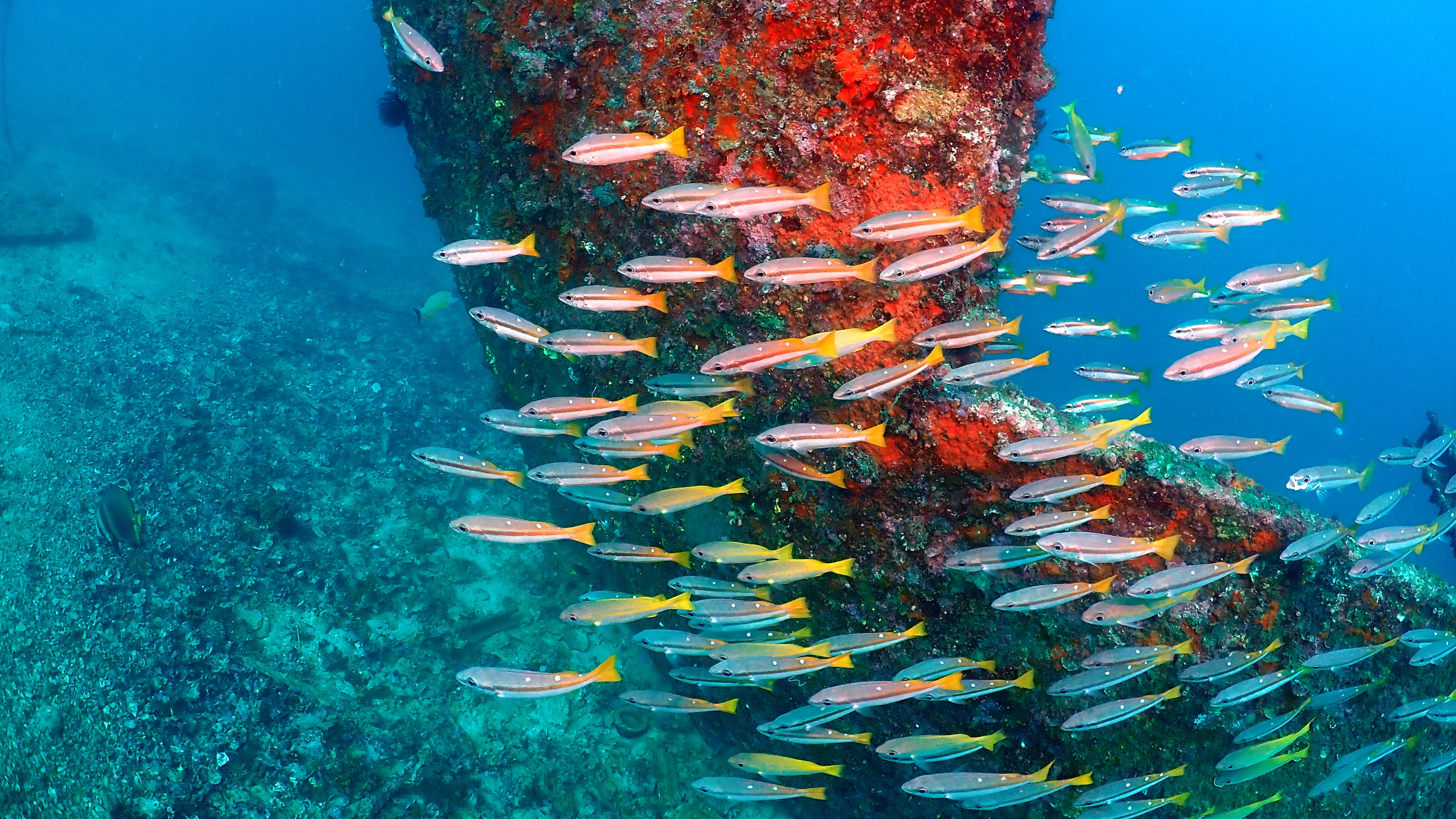 Heute gab es wieder viele Anglerfische zu sehen. Erst ein weißer mit Flecken auf der Suche nach einem neuen Standort. Gut zu sehen ist in dem Filmchen, wie er das mit dem Maul aufgenommene Wasser stoßartig aus den hinten liegenden Kiemenöffnungen presst und so vorwärtskommt. Aber auch der orange und der ganz kleine Anglerfisch waren sehr schön. Nicht zu vergessen war auch die Harlekingarnele und der Fangschreckenkrebs. Zum Schluss kurz vor Erreichen der Nullzeit habe ich dann noch ein Perlhuhn Kugelfisch in seiner Jugendform gesehen.