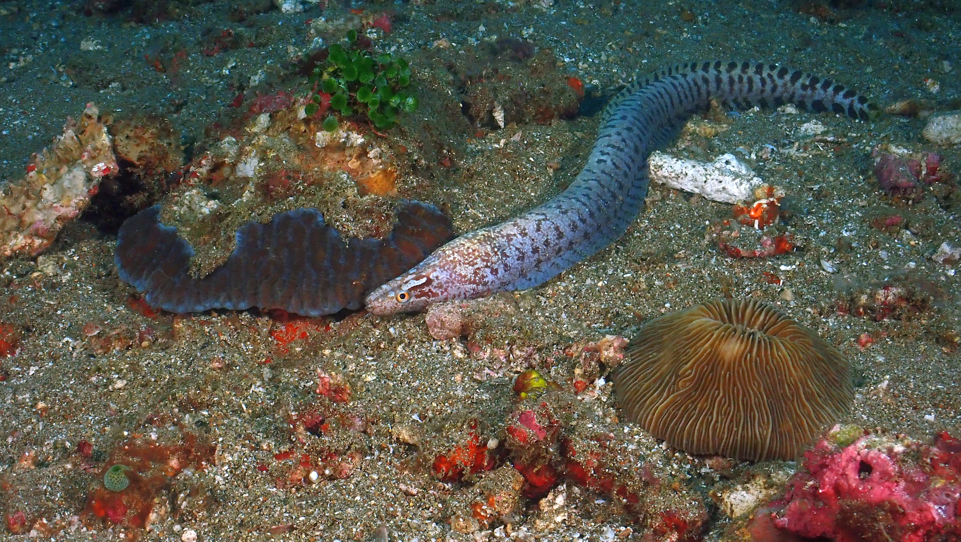 Während des ersten Tauchgangs haben wir einen Tiger-Shrimp, einen kleinen weißen Anglerfisch und an einer weißen Gorgonie dann Korallengarnelen und Seegras-Feilenfische gefunden. Beim zweiten Tauchgang ist uns gleich eine Schildkröte begegnet. Daneben konnten wir uns noch die Eier des Clownfisches, Schnepfenmesserfische und einen Drachenkopf im Sand ansehen. Beim dritten Tauchgang an einer schönen Steilwand fanden wir Schnecken, eine Muräne und viele Rifffische.