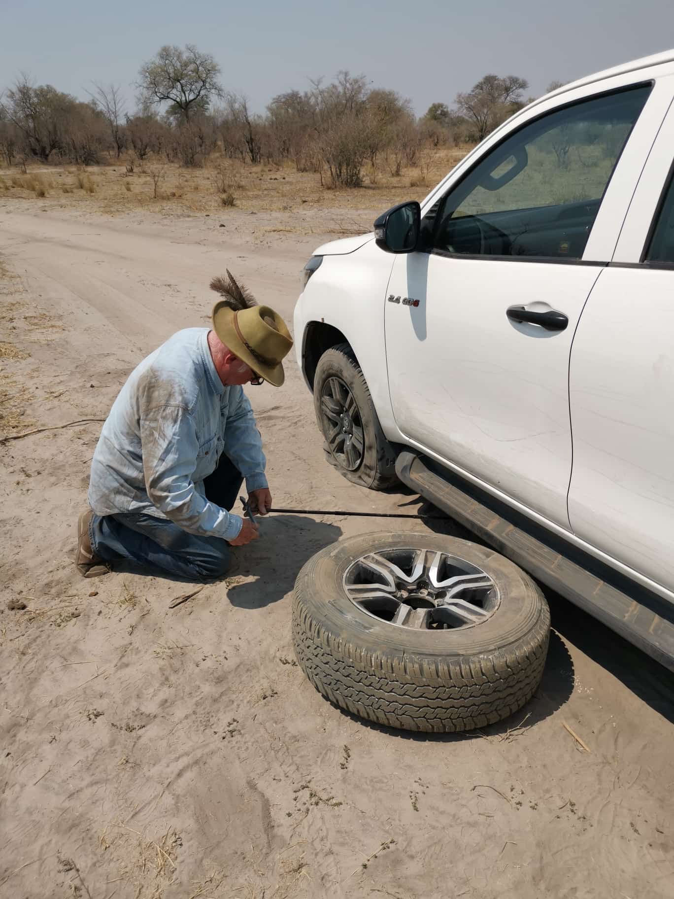 Heute führte uns unsere Reise zur Kazile Island Lodge, die auf einer privaten Insel am Ufer des Kwando-Flusses liegt (https://www.africanmonarchlodges.com/kazile-island-lodge/). Zuvor planten wir noch einen Abstecher zur "Horseshoe Bend". Die Fahrt führte uns über sandige Wege und durch dichtes Gestrüpp – bis wir plötzlich mit einem platten Reifen mitten im Nirgendwo stehen blieben. Der Reifenwechsel war ein Abenteuer für sich: In der sengenden Sonne machten wir uns daran, das Rad selbst zu wechseln. Nach etwas Anstrengung und viel Staub schafften wir es, den Ersatzreifen aufzuziehen, und setzten unsere Reise fort.