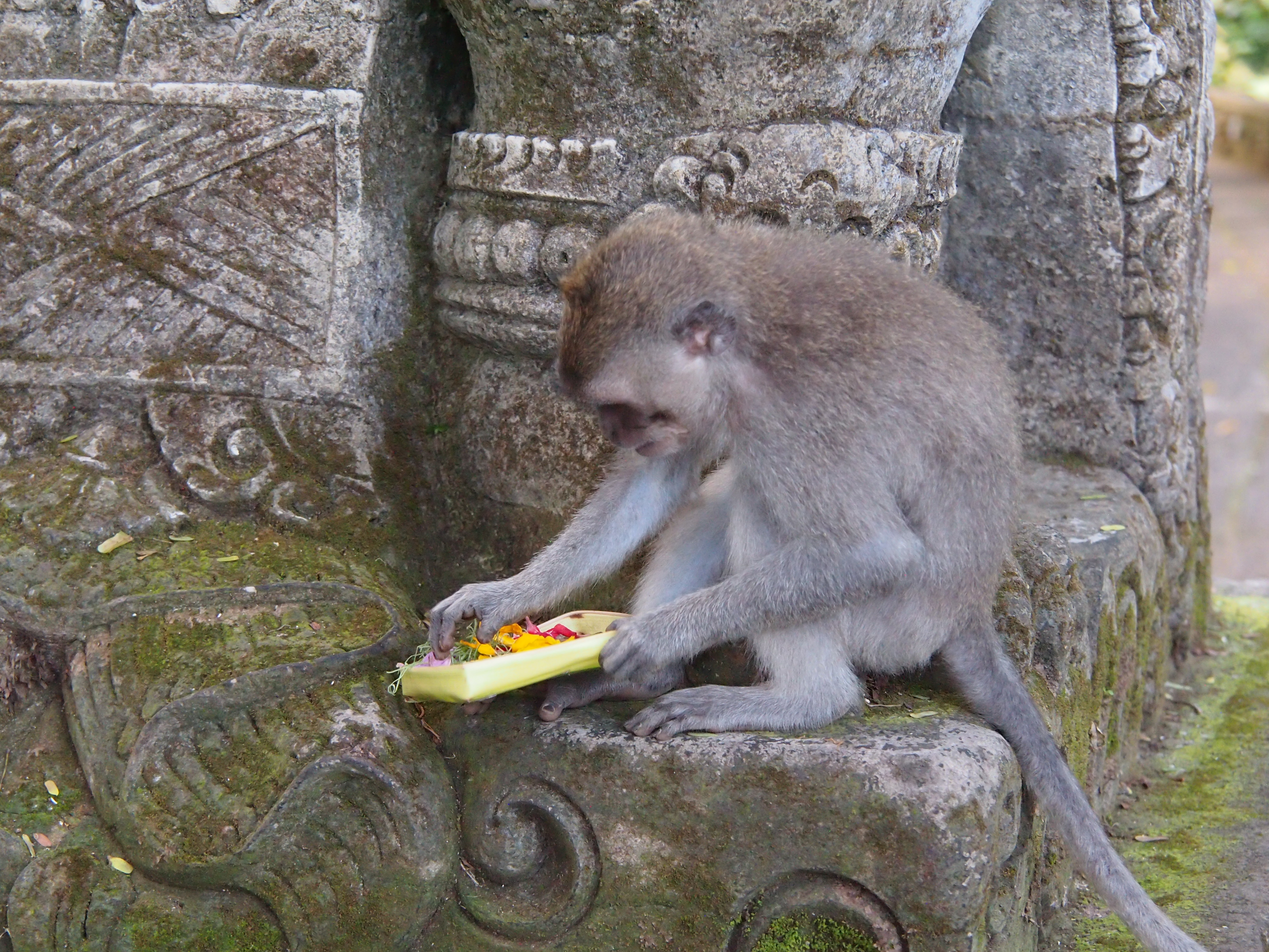 Um 09:00 Uhr ging heute Morgen unsere Rundreise mit der Fahrt zurück nach Sanur weiter. Als erstes sind wir in den Affenwald gefahren. Dort kann man wunderschön beobachten wie die Makaken durch die Bäume und über die Statuen klettern. Auch ein riesiger Ficus Benjamin mit Luftwurzeln über 30 m im Durchmesser verteilt haben wir dort bestaunt. Danach ging es weiter zu einer wunderschön im Hang gelegen Reis-Terrasse. Sehr interessant war auch ein Besuch in einem kleinen Gewürz und Kaffeehandel. Wir sahen die verschiedenen Bäume und Früchte welche hier wachsen. Auch konnten wir die verschiedenen Stufen der Kaffeeherstellung beobachten. Einschließlich der Mungos welche die Kaffeebohnen fressen und dann wieder ausscheiden was dann den berühmten Luwak Kaffee ergibt. All diese verschiedenen Sorten konnten wir hier probieren. Nach dem Mittagessen sind wir dann noch in eine Holzschnitzerei gefahren wo Peter sich einen Barong und Claudia sich einen Elefanten erhandelt haben. Auf speziellen Wunsch von Peter ging es dann noch zum Harley Händler bevor wir unser ausgewaschenes und getrocknetes Tauchgepäck in der Ena Tauchbasis in Empfang nehmen konnten. Dort haben wir dann den einen zusätzlichen Tauchtag bezahlt und bekamen eine landestypische Schnitzerei mit unserem Namen geschenkt. Angekommen im Puri Mesari Hotel haben wir die letzte Gelegenheit genutzt uns nochmal eine Massage zu gönnen und haben dann auch im Hotel lecker zu Abend gegessen.