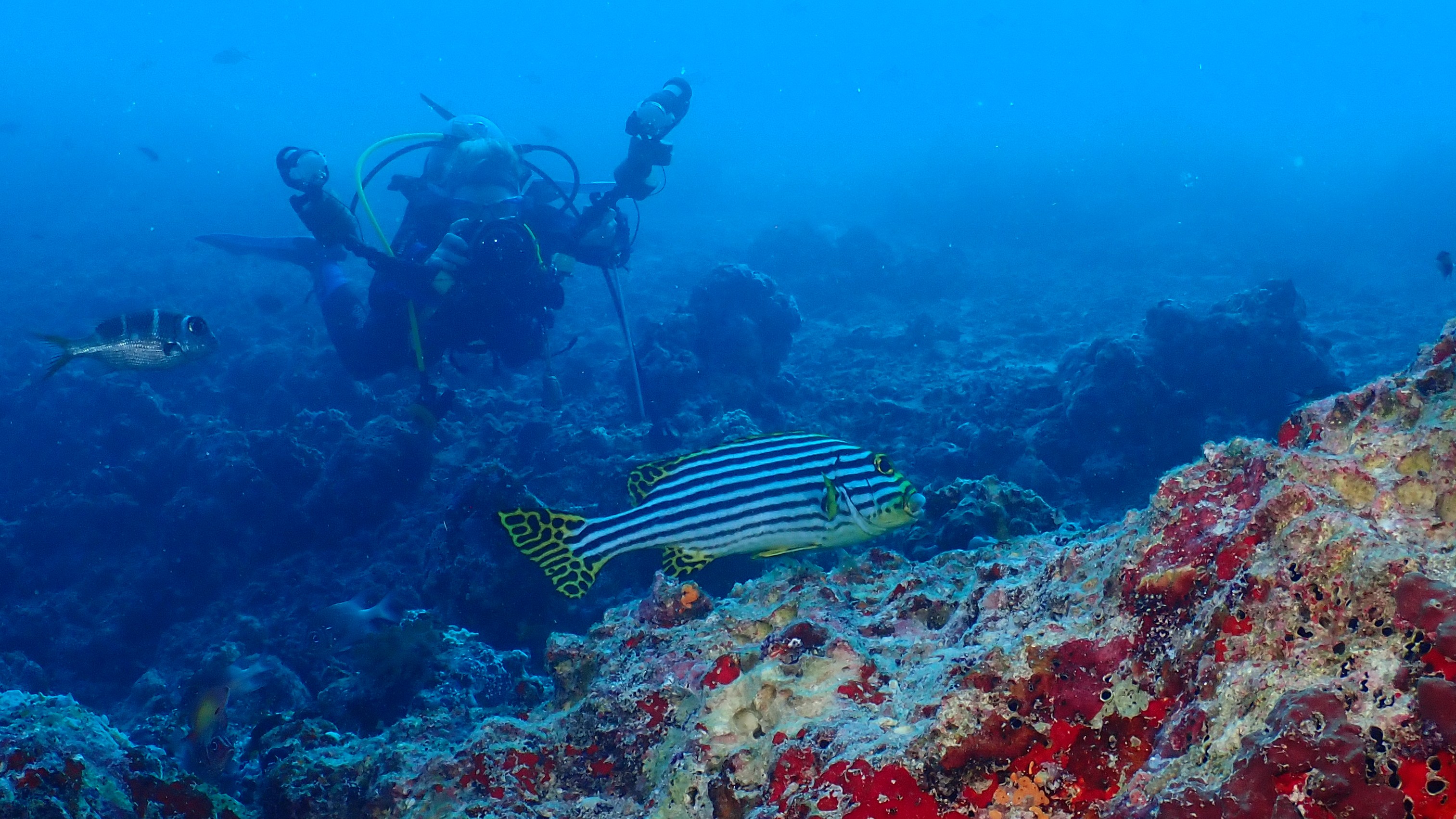 Heute waren wir 3 mal tauchen. Beim ersten mal am Einstieg 5 haben wir einen roten Frogfisch gesehen. Vor dem Mittagesseen waren wir dann nochmal vom Einstieg 5 in Richtung 6 tauchen und haben unter anderem eine schöne Muräne mit Putzergarnelen gesehen. Nachmittags sind wir dann nochmal an der Steilwand von 2 nach 3 gewesen.