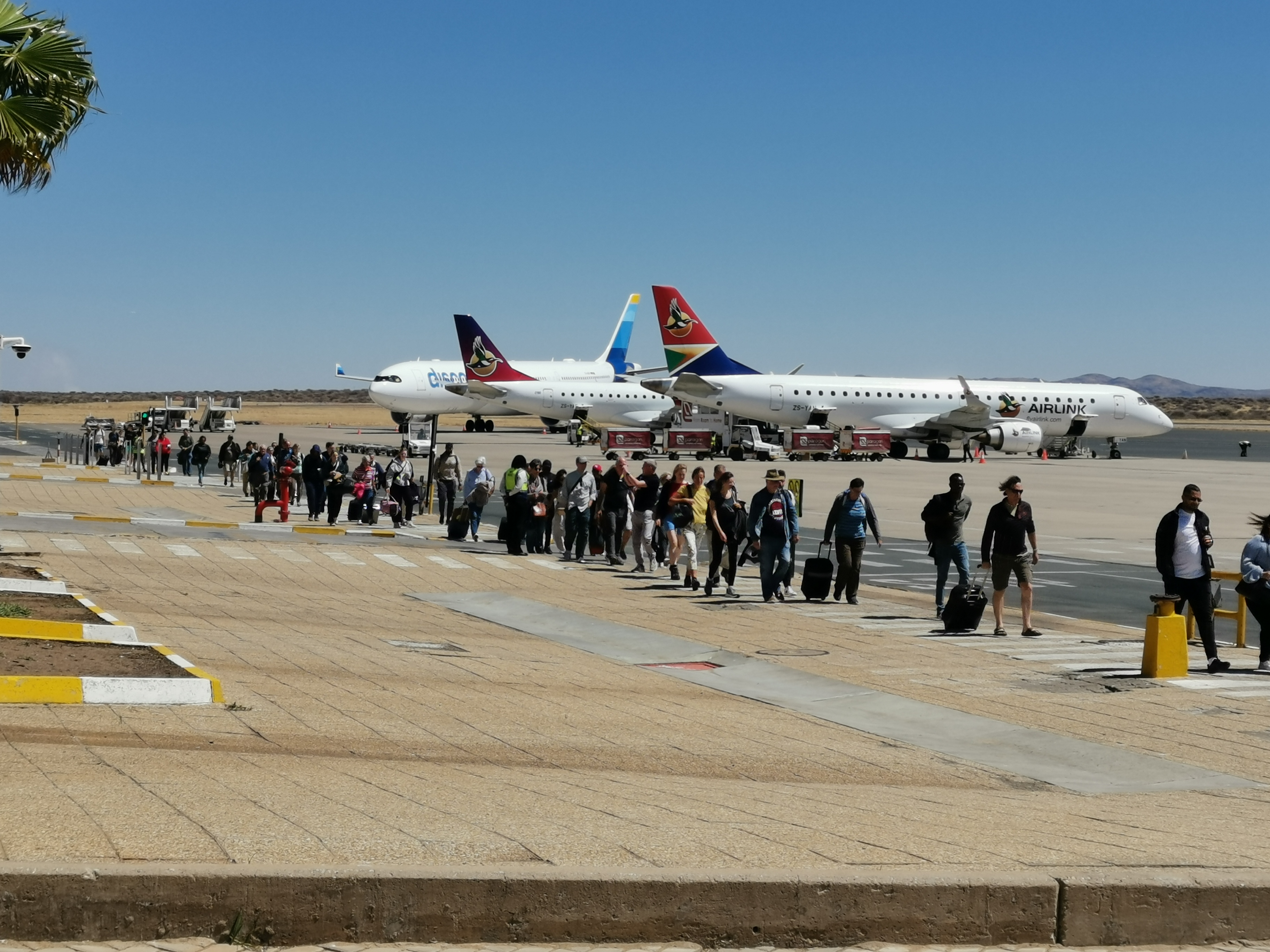 Um 8:30 Uhr sind wir planmäßig in Johannesburg gelandet. Da unser Gepäck bereits bis zum Endziel durchgecheckt war, konnten wir entspannt unseren Anschlussflug um 10:40 Uhr nach Windhoek erreichen. Auch für diesen Flug hatten wir uns vorab Sitze (11D und 11F) reserviert. Um 12:55 Uhr landeten wir schließlich in Windhoek.