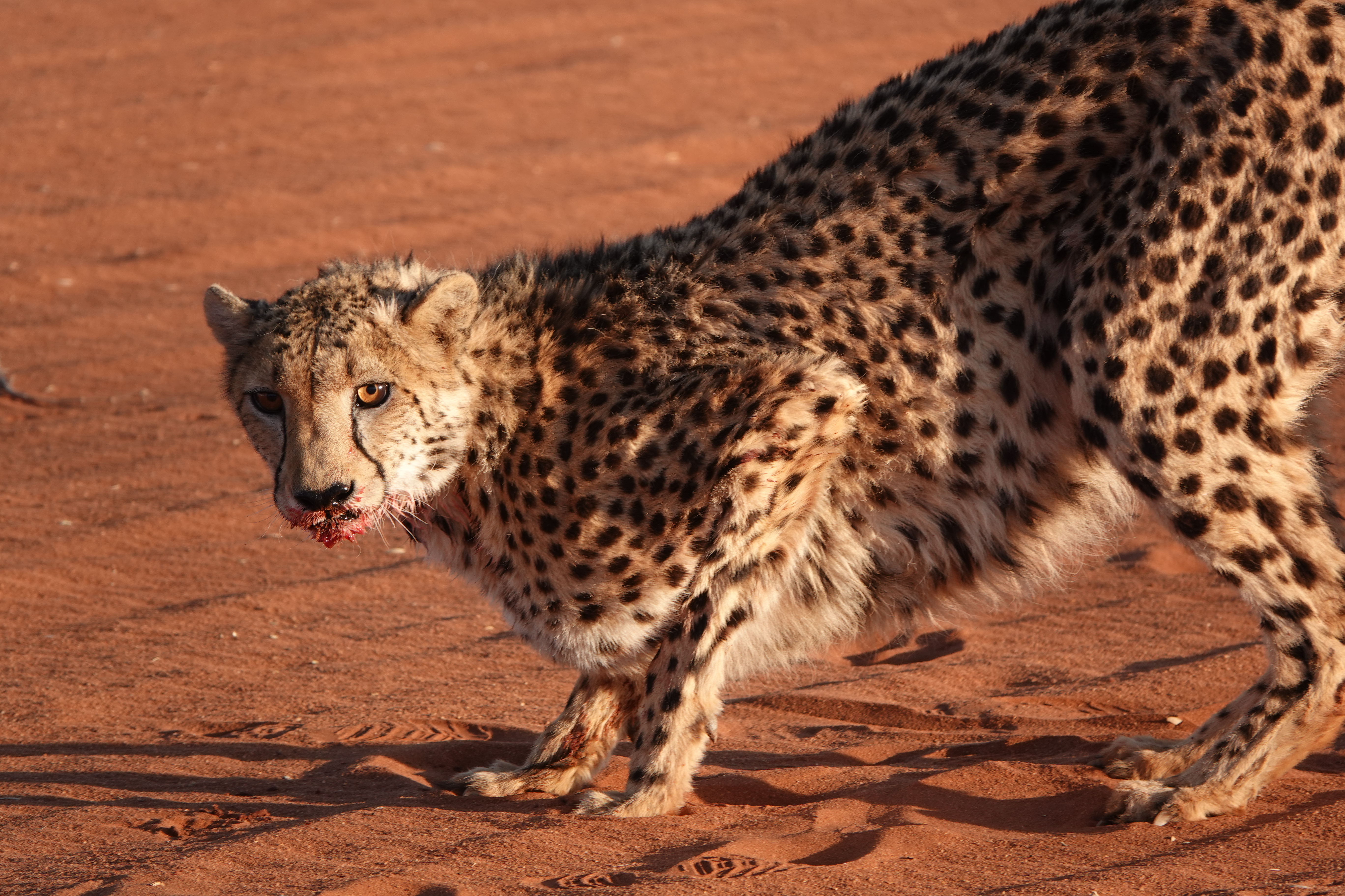 Das absolute Highlight war jedoch die Gepardenfütterung. Die Bagatelle Lodge kümmert sich um junge Geparden, die verwaist sind und ohne Hilfe nicht überlebt hätten. Es war faszinierend zu sehen, wie die Geparden dem Rangerjeep hinterherjagten, um ihre Mahlzeit zu erhalten.
