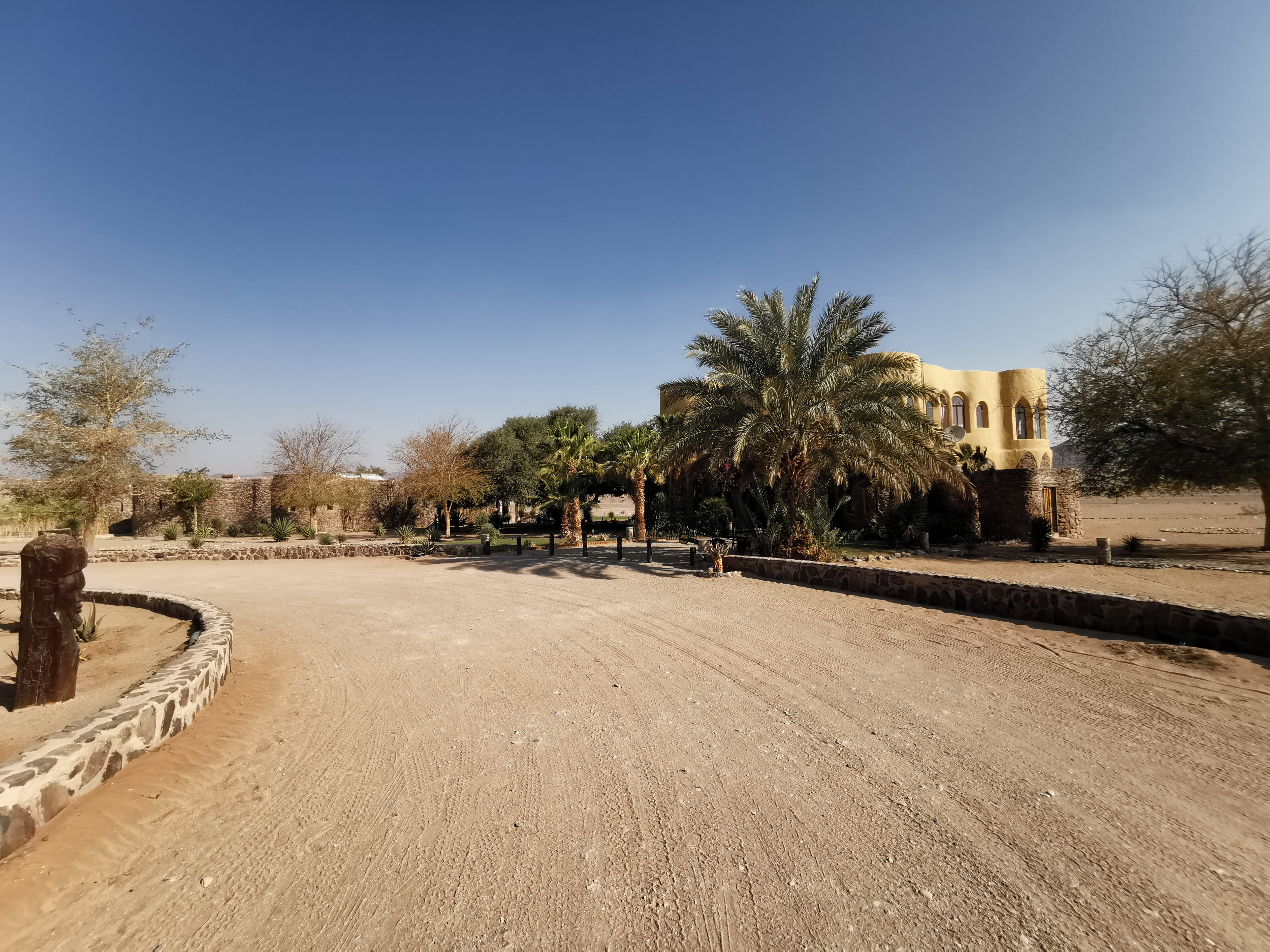 Am Morgen ließen wir es etwas ruhiger angehen und starteten unsere Fahrt in Richtung Sossusvlei erst gegen 10:00 Uhr. Unser Ziel war das Le Mirage Resort & Spa (https://www.mirage-lodge.com/de/), eine eindrucksvolle Oase mitten in der Wüste. Unterwegs legten wir einen kurzen Tankstopp ein und entdeckten in der Nähe der Straße eine majestätische Oryxantilope.