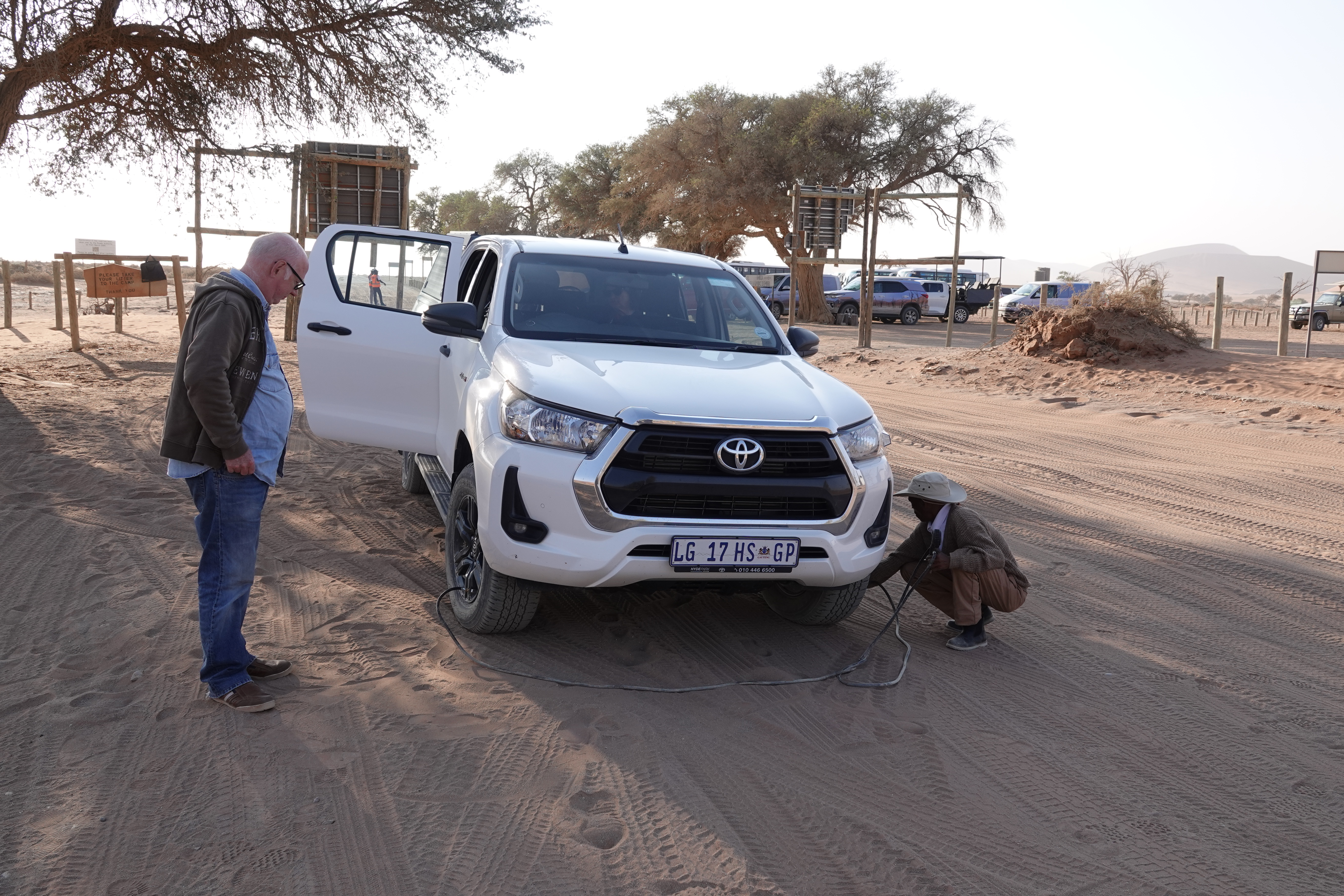 Heute starteten wir bereits um 7:15 Uhr mit einem schnellen Frühstück, um pünktlich zur Öffnung des Sossusvlei-Parks da zu sein, wenn das Licht die Landschaft in den schönsten Farben erstrahlen lässt. Am 2WD-Parkplatz ließen wir etwas Luft aus den Reifen ab, um besser durch den Sand bis zum Beginn des Deadflei-Weges zu kommen.