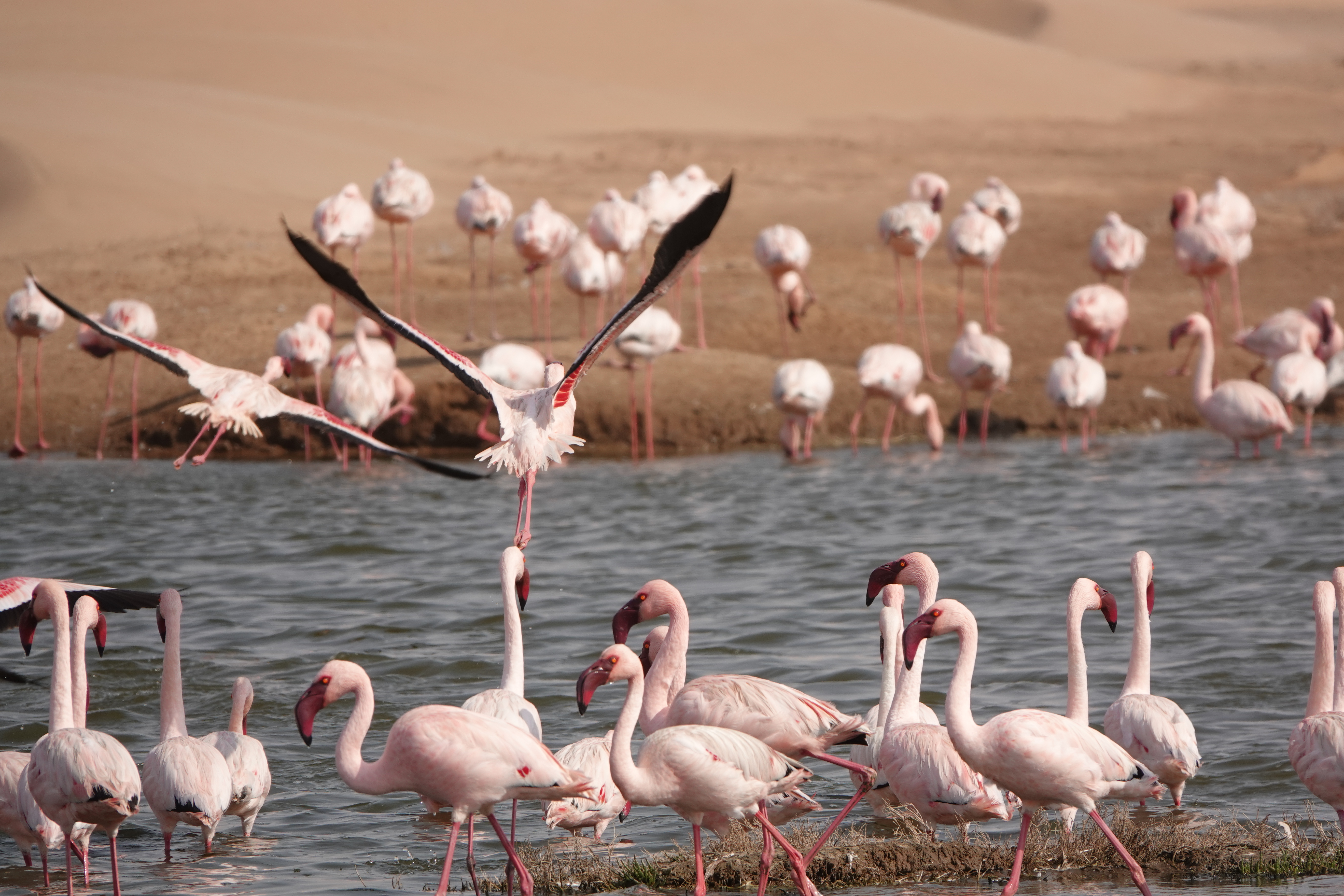 Weiter ging es über zwei Pässe und schließlich über Walvis Bay nach Swakopmund, wo wir im Namib Guesthouse (https://www.namibguesthouse.com/de/) eingecheckt haben. Kurz vor Swakopmund hatten wir das Glück, eine Kolonie von Flamingos aus nächster Nähe beim Futter suchen, starten und landen beobachten zu können – ein beeindruckendes Naturschauspiel.