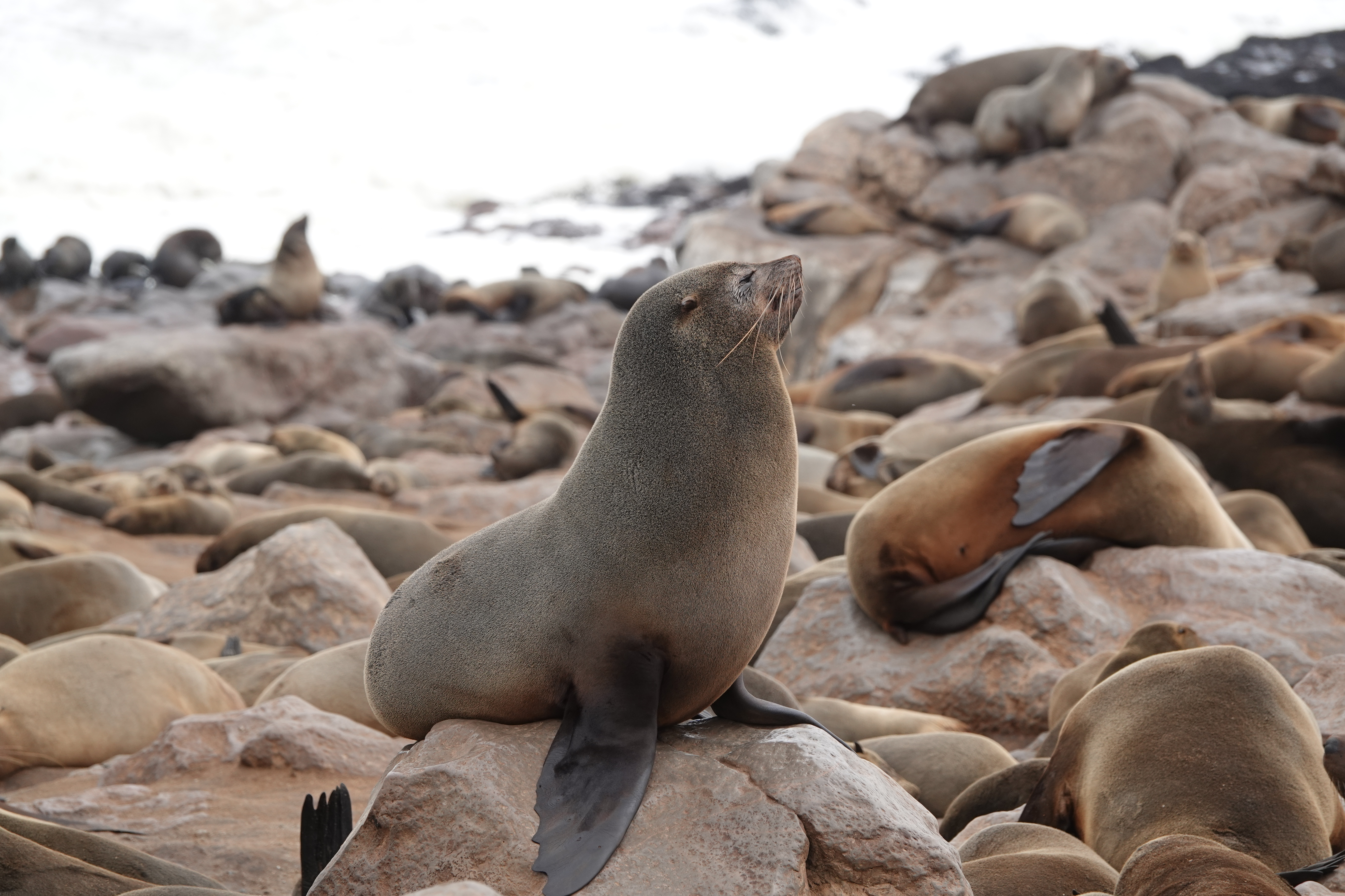 Unser Tag begann mit einem Zwischenstopp bei Cape Cross, da wir die berühmte Seelöwenkolonie unbedingt sehen wollten. Über eine Stunde verbrachten wir dort, fasziniert von den vielen kleinen und großen Seelöwen, die uns immer wieder neue Eindrücke bescherten. Dieser Ausflug hat sich wirklich gelohnt!