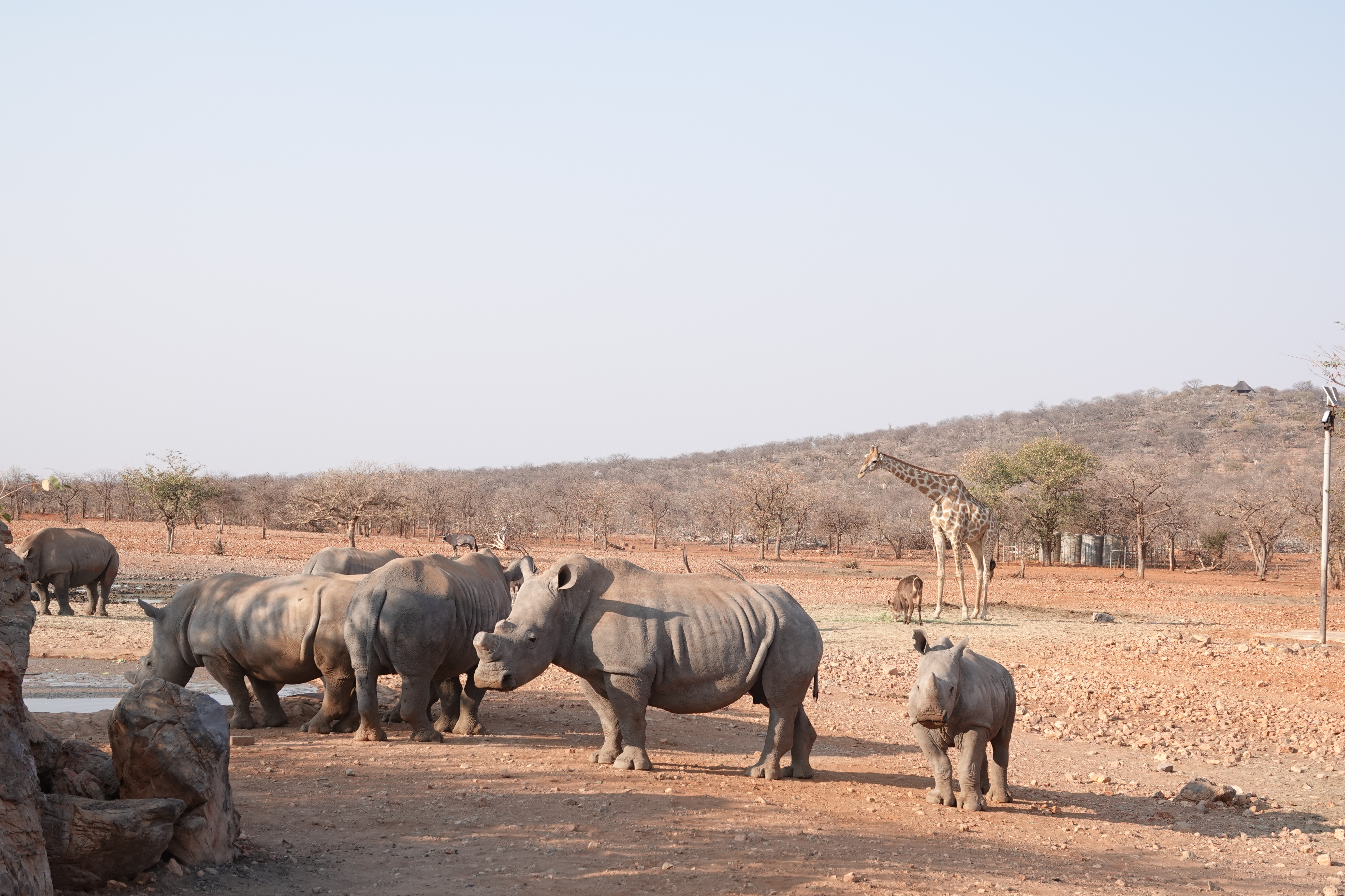 Die Okutala Etosha Lodge empfing uns mit ihrer besonderen Lage und einem hauseigenen Wasserloch, das perfekt für Tierbeobachtungen ist. Besonders beeindruckend war der Unterstand, der es uns ermöglichte, die Tiere hautnah zu erleben. Hier sahen wir eine beeindruckende Vielfalt an Giraffen, Nashörner, Zebras, Oryxantilopen, Springböcke, Wasserbüffel und auch einige Perlhühner.