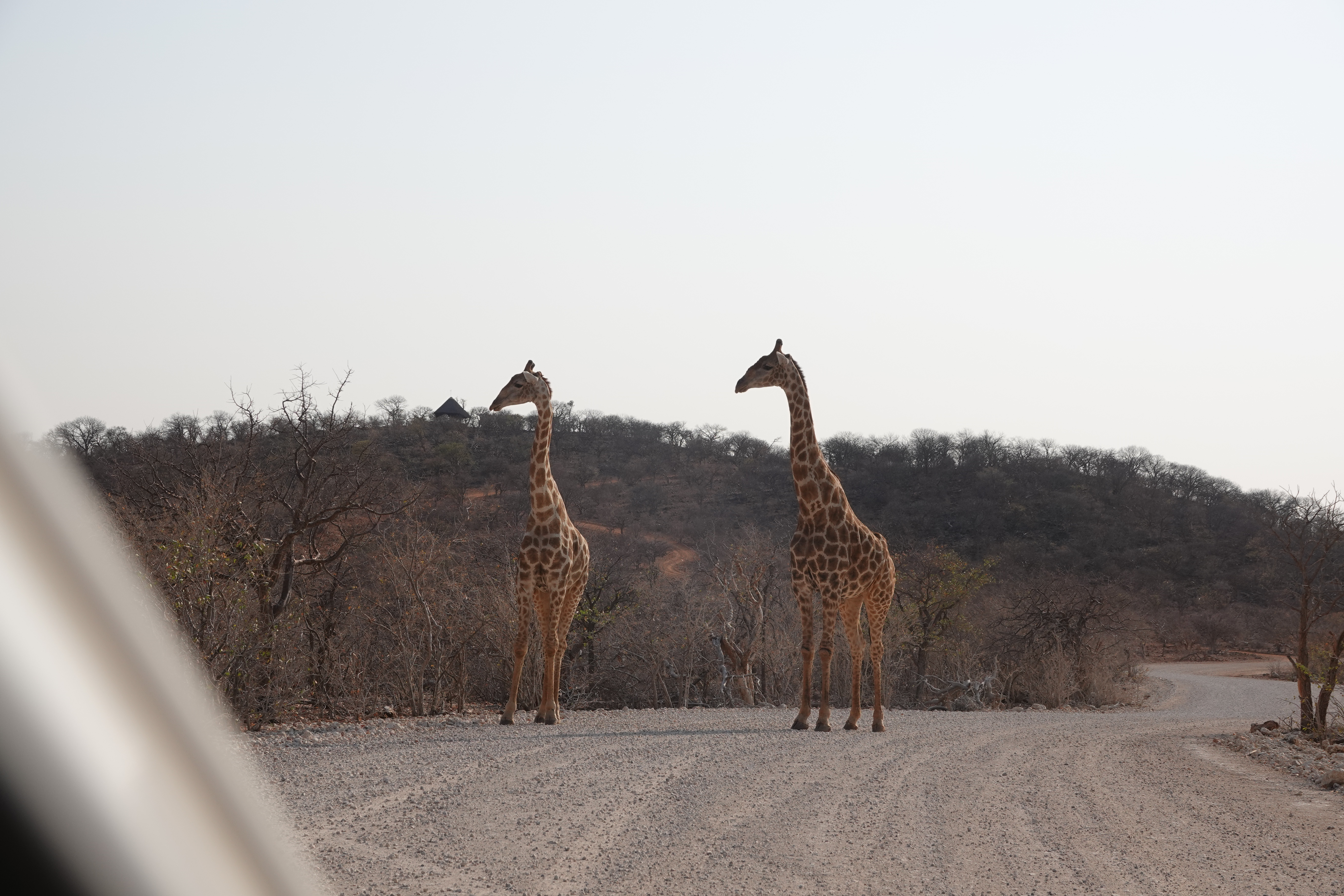 Unser Tag begann mit einem letzten Frühstück in der Okutala Etosha Lodge, begleitet von einem herrlichen Blick auf die Wasserstelle. Bei der Abfahrt hielten uns noch zwei Giraffen auf, die sich gemütlich in den Weg stellten und uns nicht sofort weiterfahren ließen.