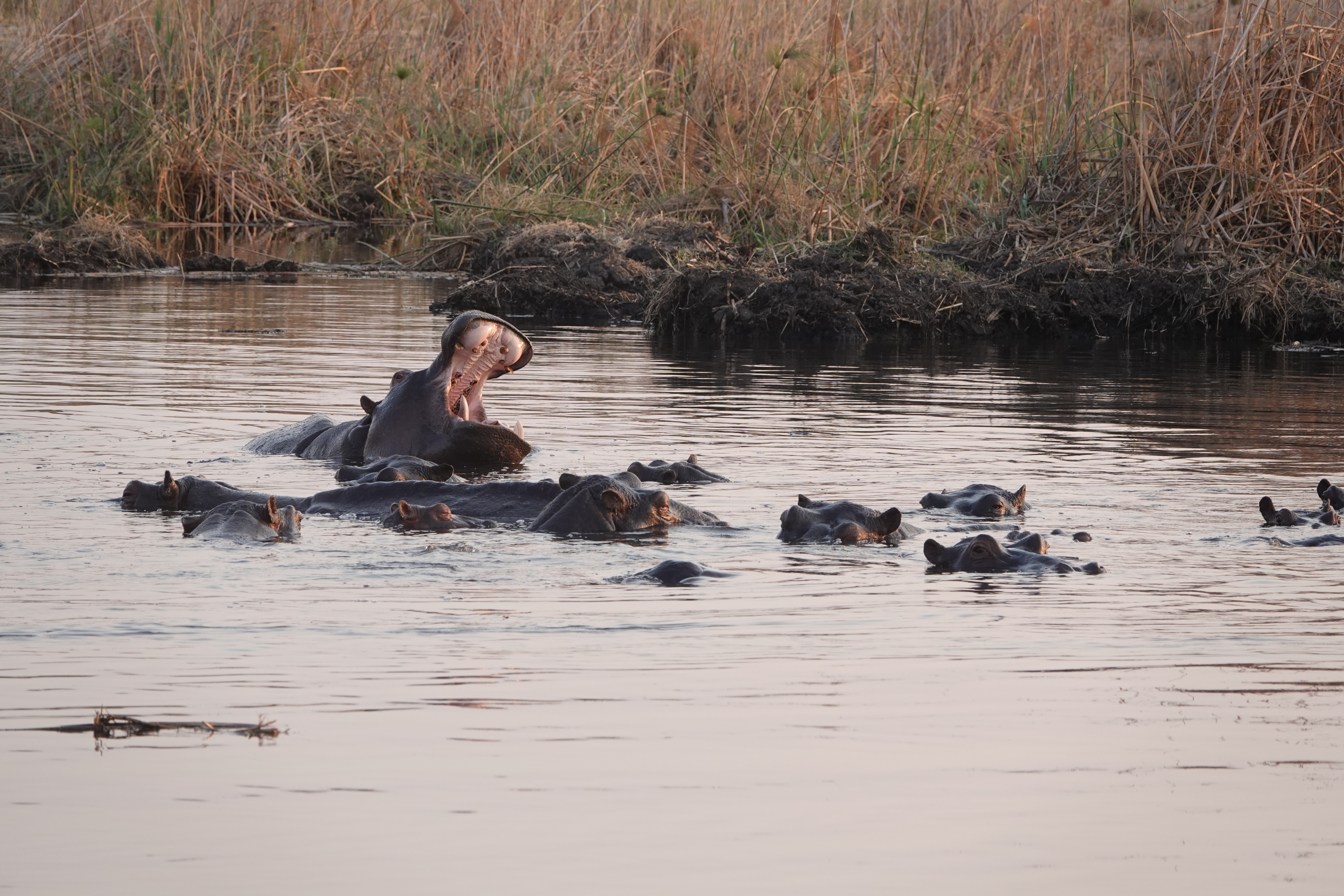 Am Abend unternahmen wir eine Bootsfahrt auf dem Kwando, bei der wir Krokodile und Flusspferde aus nächster Nähe beobachten konnten. Den Tag ließen wir mit einem Sundowner direkt am Fluss, in der Nähe der Nilpferde, entspannt ausklingen.