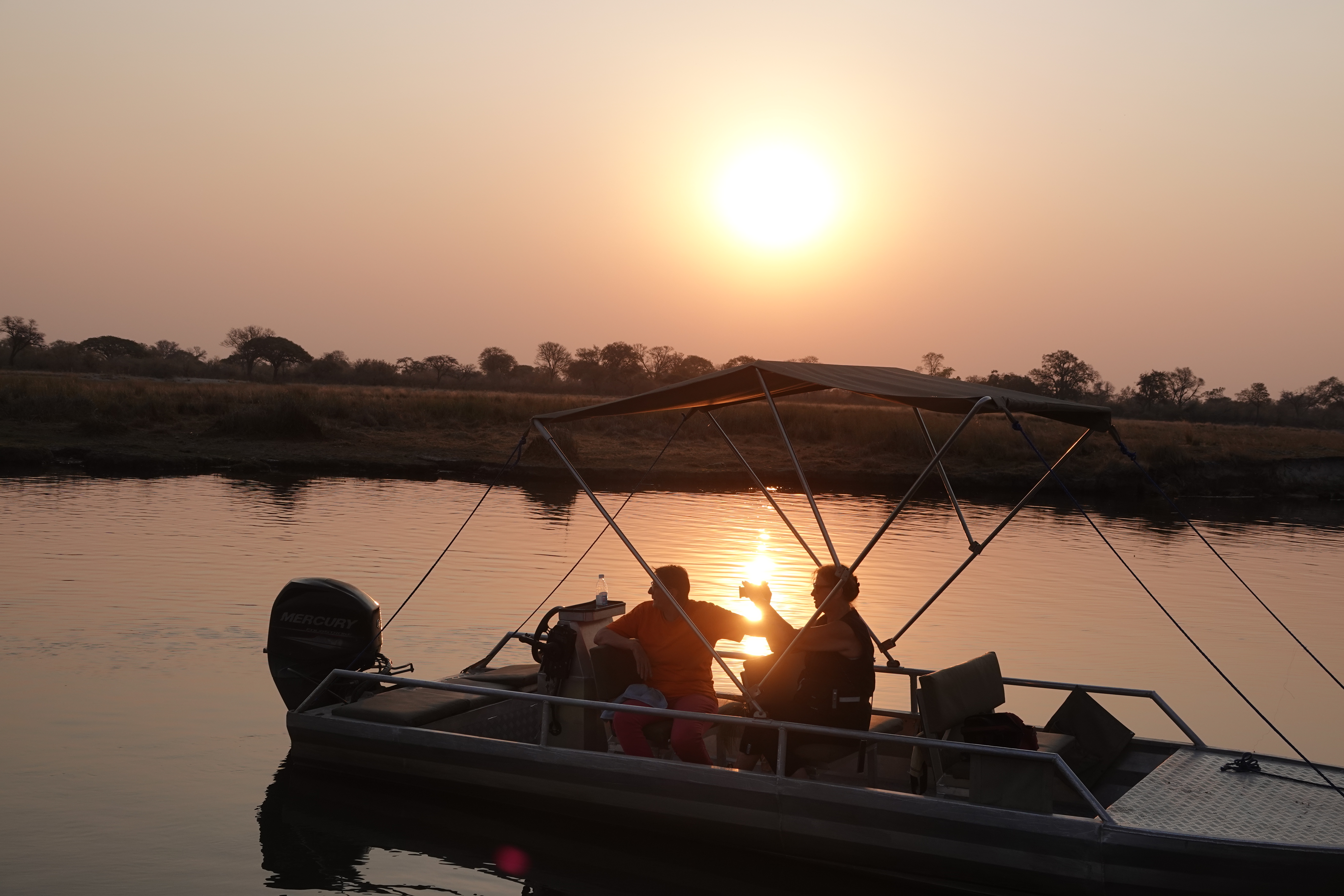 Am Abend unternahmen wir eine Bootsfahrt auf dem Kwando, bei der wir Krokodile und Flusspferde aus nächster Nähe beobachten konnten. Den Tag ließen wir mit einem Sundowner direkt am Fluss, in der Nähe der Nilpferde, entspannt ausklingen.