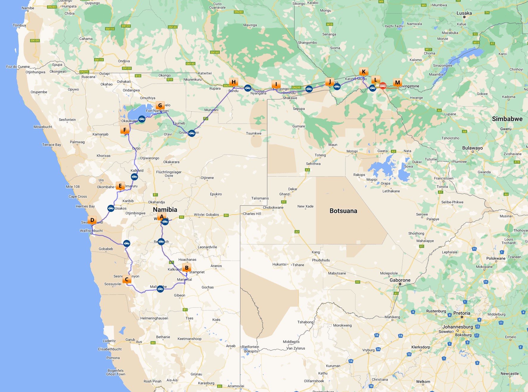 Von den endlosen Weiten der Kalahari-Wüste über die wilden Tiere des Etosha-Nationalparks bis hin zu den spektakulären Landschaften des Caprivi-Streifens – jeder Zwischenstopp unserer Reise ist ein weiterer Höhepunkt. Doch das Ziel, die tosenden Viktoriafälle, verspricht den krönenden Abschluss unserer Reise zu werden.