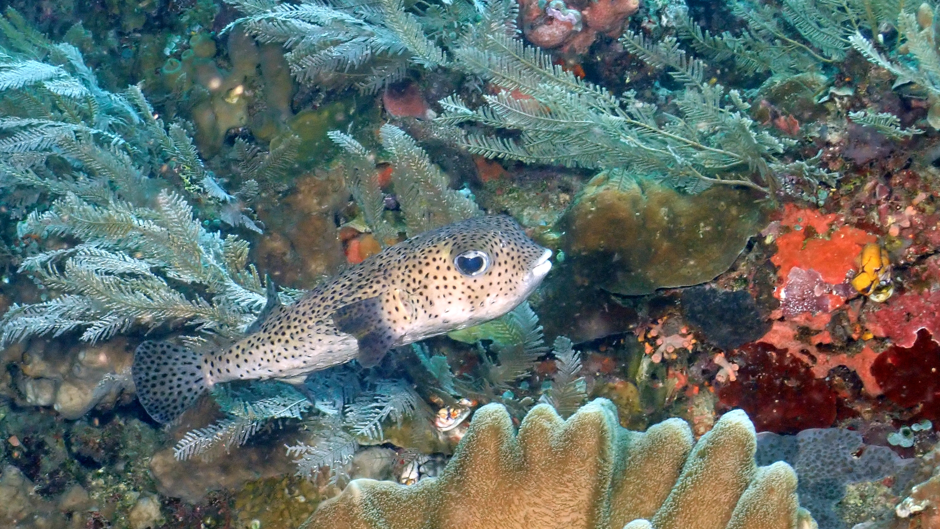 Heute starteten wir früh in den Tag: Bereits um 7:00 Uhr saßen wir beim Frühstück, denn um 8:00 Uhr legte unser Boot zu zwei Tauchgängen ab. Beim ersten Tauchgang begeisterte mich besonders ein leuchtend gelber Kofferfisch sowie ein rötlicher Schaukelfisch, der direkt neben einer beeindruckenden Schildkröte von gut 1,2 Metern Größe saß. Im zweiten Tauchgang entdeckten wir einen Blattwurm und bewunderten vor allem die eleganten Federsterne.