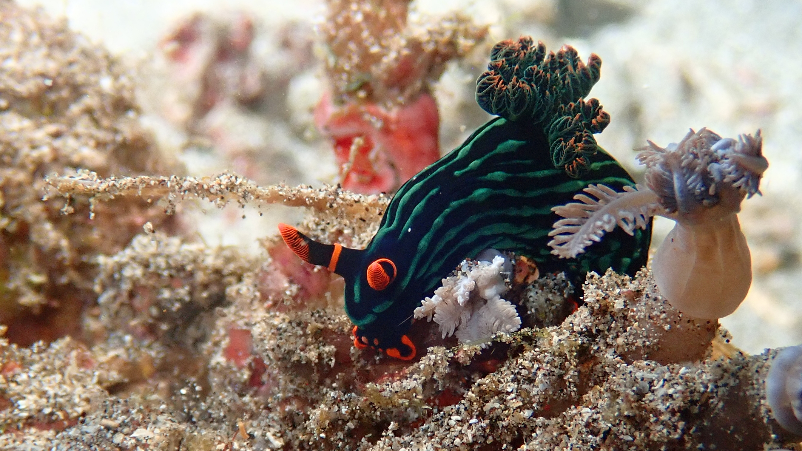 Heute begrüßte uns der Morgen mit Regen – doch das störte uns nicht, denn für Makro-Tauchgänge ist fehlendes Sonnenlicht kein Nachteil. So machten wir uns auf zu zwei spannenden Unterwasser-Entdeckungen. Besonders gefreut haben wir uns über einen eleganten Geisterpfeifenfisch, die farbenprächtige Nacktschnecke Dusky Nembrotha sowie verschiedene Garnelenarten. Trotz des grauen Wetters über Wasser erlebten wir unter Wasser ein buntes Highlight nach dem anderen.