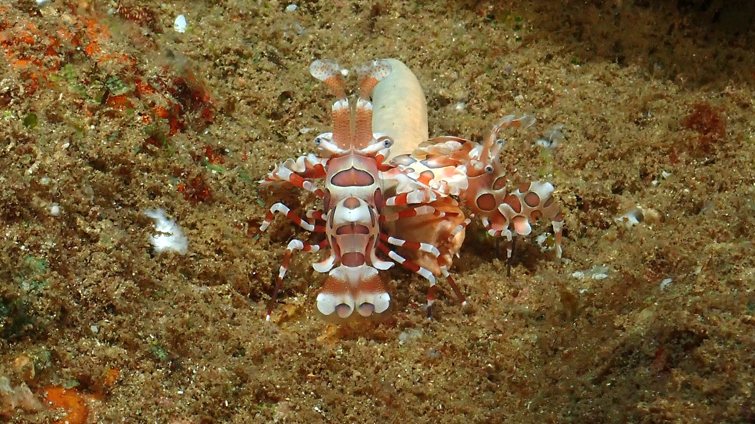 Der erste Tauchgang des Tages brachte diesmal nicht allzu viele Besonderheiten. Spannender wurde es beim zweiten: Nach wenigen Minuten gerieten wir in eine starke Strömung, die uns erst rasant an der Steilwand entlangtrieb und schließlich auch noch in der Höhe herumwirbelte. Sicherheitshalber brachen wir den Tauchgang ab. Ganz anders dagegen der Nachttauchgang – ein echtes Erlebnis! Im Licht unserer Lampen sahen wir einen Rotfeuerfisch und einen Schaukelfisch bei der Jagd, entdeckten einen kleinen Anglerfisch und zum krönenden Abschluss gleich zwei seltene Harlekingarnelen. Ein unvergesslicher Abschluss des Tauchtages.