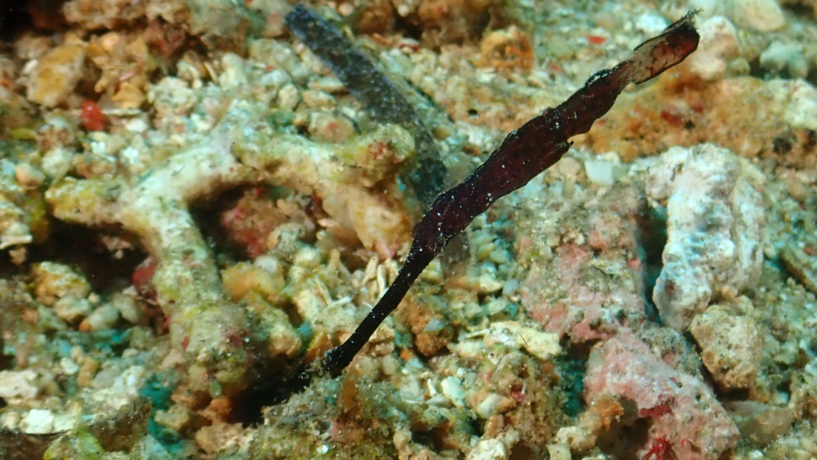 Diesmal führte uns das Boot auf die Festlandseite in Richtung Manado, wo wir zwei spannende Tauchgänge unternahmen. Besonders beeindruckend waren ein eleganter Geisterpfeifenfisch und – als Highlight – ein Geisterfetzenfisch. Ein gebänderter Kieferfisch sorgte außerdem für ein Schmunzeln, als er rückwärts in seine Höhle „einparkte“.