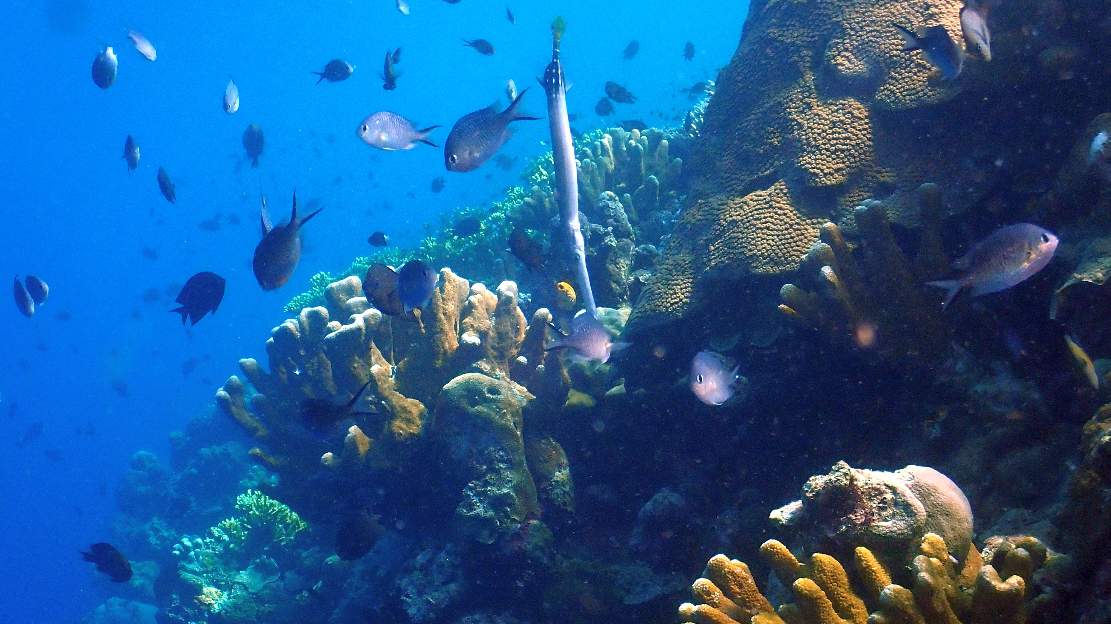 Am Vormittag erwarteten uns zwei ganz besondere Tauchgänge. Zuerst glitten wir an einer zerklüfteten Steilwand entlang, wo die einfallenden Sonnenstrahlen zwischen den Felsen tanzten und magische Lichtspiele auf den Grund zauberten – ein Moment zum Innehalten. Noch eindrucksvoller war jedoch der zweite Tauchgang an der „Turtle Street“: Schildkröte um Schildkröte kreuzte unseren Weg, so viele, dass wir kaum wussten, wohin wir zuerst schauen sollten. Dieses Erlebnis wird uns sicher lange in Erinnerung bleiben.