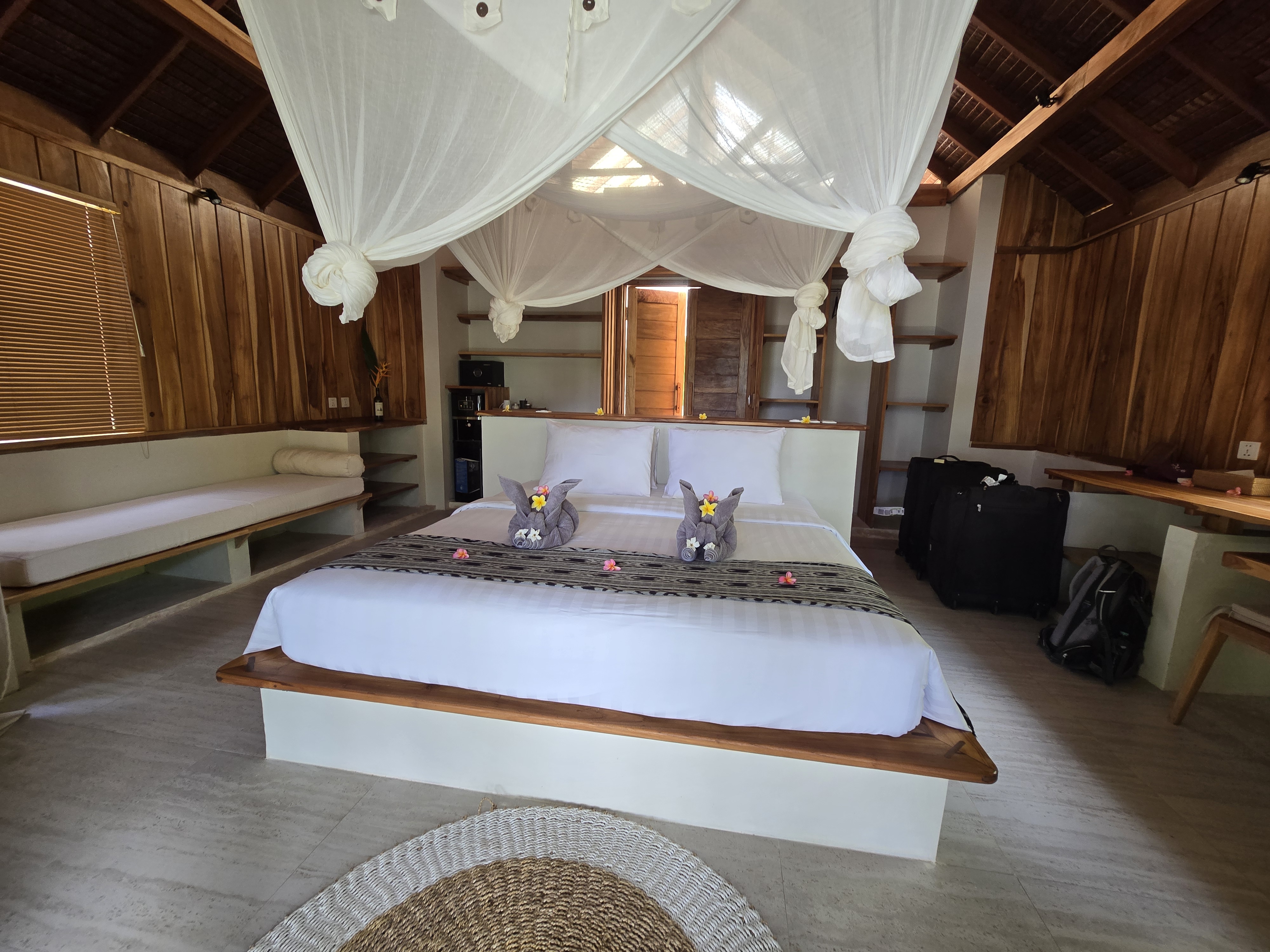 Gegen 10:00 Uhr starteten wir mit dem Boot zurück nach Manado. Von dort brachte uns ein Auto quer über die Insel zu einem kleinen Anleger, wo bereits das nächste Boot auf uns wartete. Nach einer kurzen Überfahrt von nur zehn Minuten erreichten wir unser neues Ziel: die Insel Lembeh. Das D’Lagoon erwies sich sofort als echtes Kleinod – ein charmantes Resort mit nur fünf Bungalows, direkt am Wasser gelegen. Den Nachmittag nutzten wir, um uns zu erholen und die ruhige Atmosphäre zu genießen. Die Vorfreude auf die kommenden Tauchtage hier ist groß.