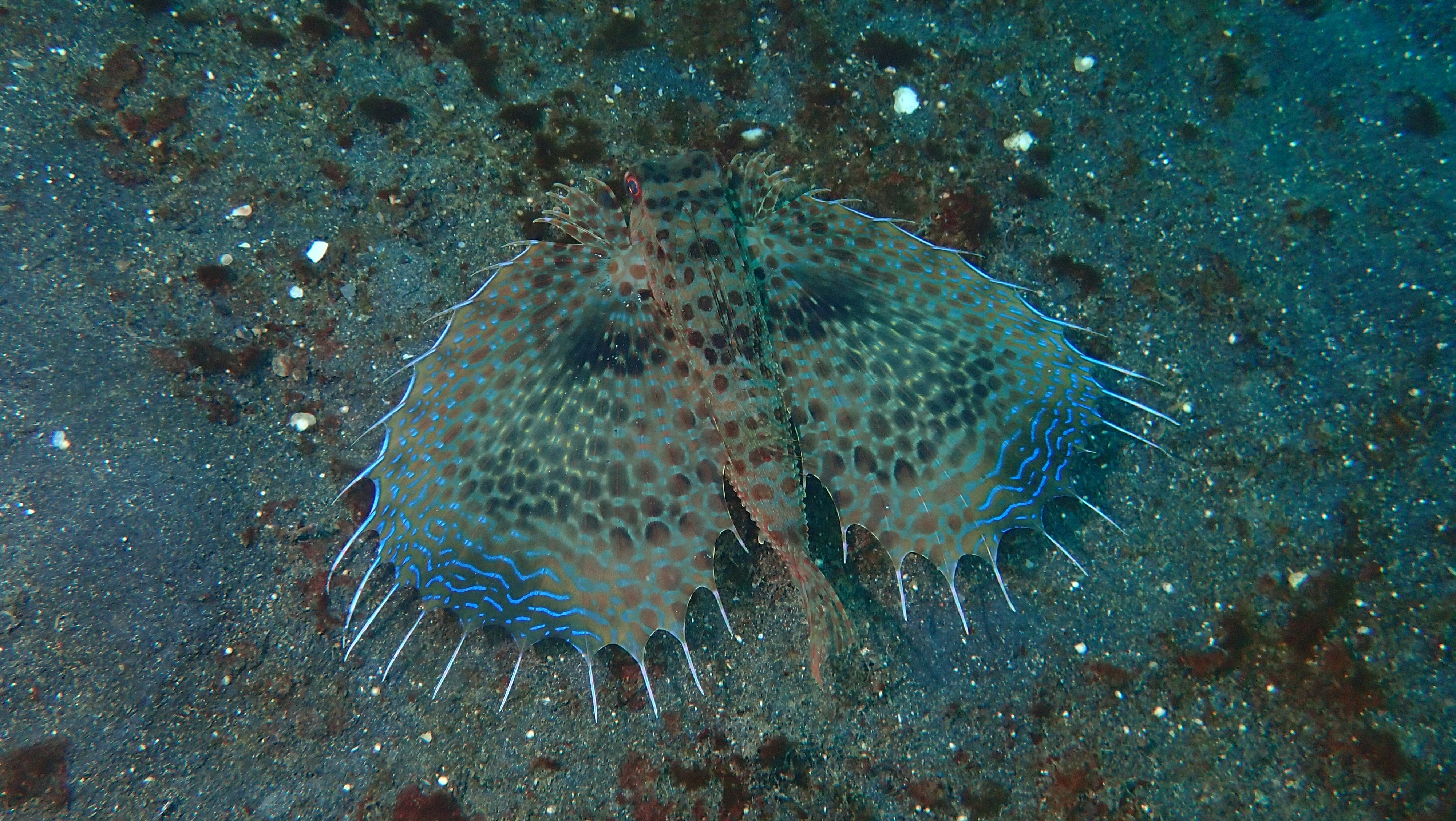 Gleich zweimal konnten wir heute einen Helm-Flughahn beobachten, der beeindruckend seine farbenprächtigen „Flügel“ ausbreitete. Besonders schön war auch die gelbe Korallengrundel mit ihren blauen Augen und dem fast durchscheinenden Körper. Darüber hinaus entdeckten wir mehrere „Lembeh-Drachen“-Schnecken. Ein weiteres Highlight war eine helle Sepia, die sich perfekt in Form und Farbe an die Weichkoralle angepasst hatte – ein fantastisches Beispiel für Tarnung unter Wasser.