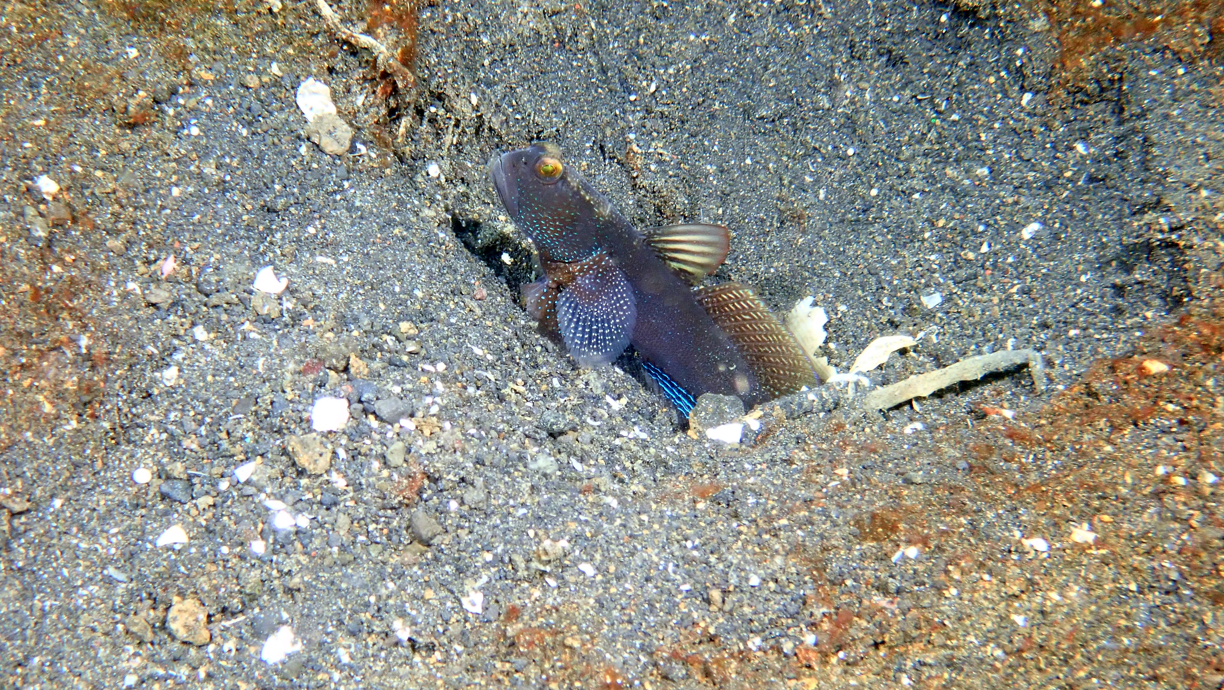 Gleich zweimal konnten wir heute einen Helm-Flughahn beobachten, der beeindruckend seine farbenprächtigen „Flügel“ ausbreitete. Besonders schön war auch die gelbe Korallengrundel mit ihren blauen Augen und dem fast durchscheinenden Körper. Darüber hinaus entdeckten wir mehrere „Lembeh-Drachen“-Schnecken. Ein weiteres Highlight war eine helle Sepia, die sich perfekt in Form und Farbe an die Weichkoralle angepasst hatte – ein fantastisches Beispiel für Tarnung unter Wasser.