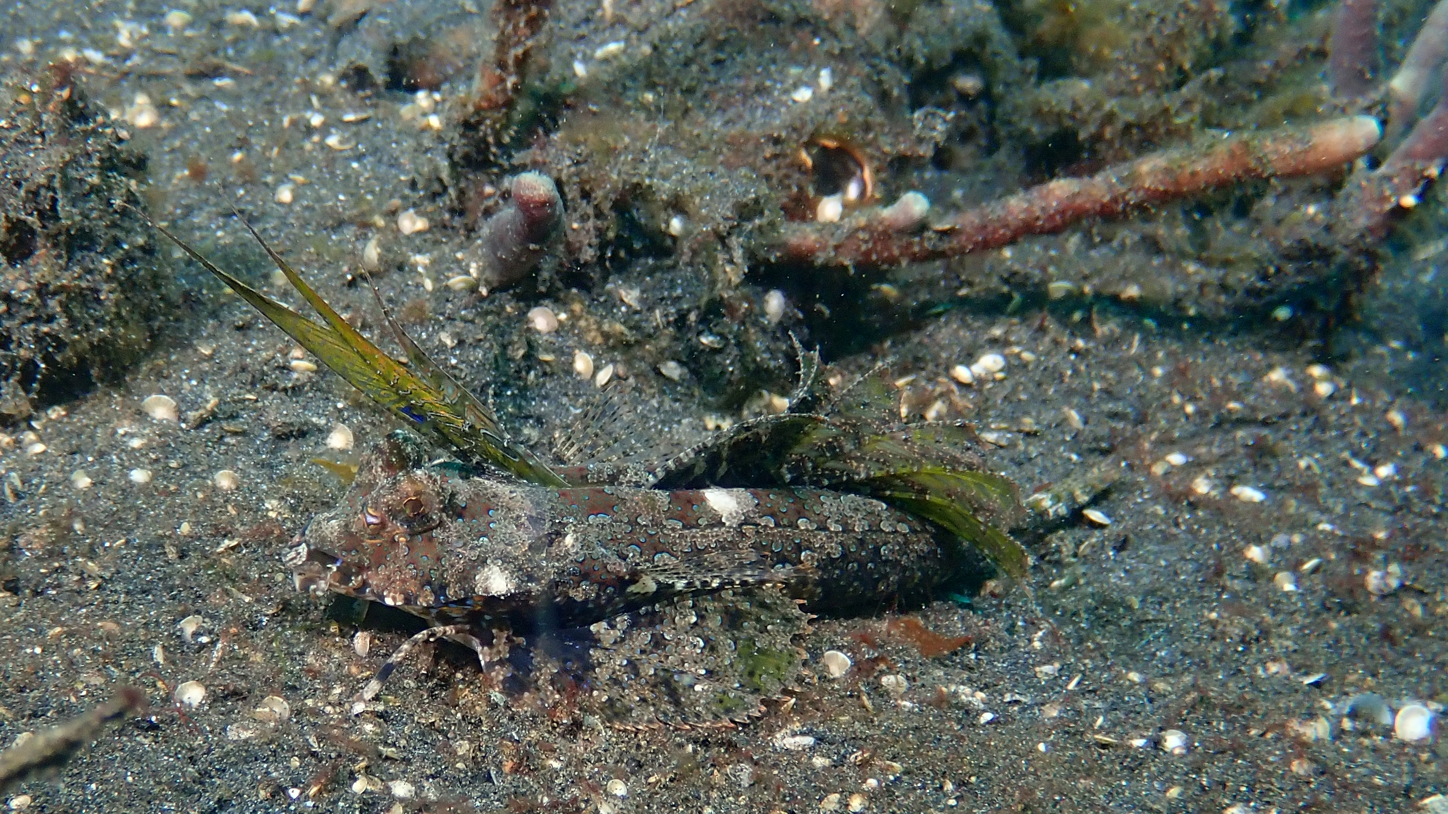 Gleich zweimal konnten wir heute einen Helm-Flughahn beobachten, der beeindruckend seine farbenprächtigen „Flügel“ ausbreitete. Besonders schön war auch die gelbe Korallengrundel mit ihren blauen Augen und dem fast durchscheinenden Körper. Darüber hinaus entdeckten wir mehrere „Lembeh-Drachen“-Schnecken. Ein weiteres Highlight war eine helle Sepia, die sich perfekt in Form und Farbe an die Weichkoralle angepasst hatte – ein fantastisches Beispiel für Tarnung unter Wasser.