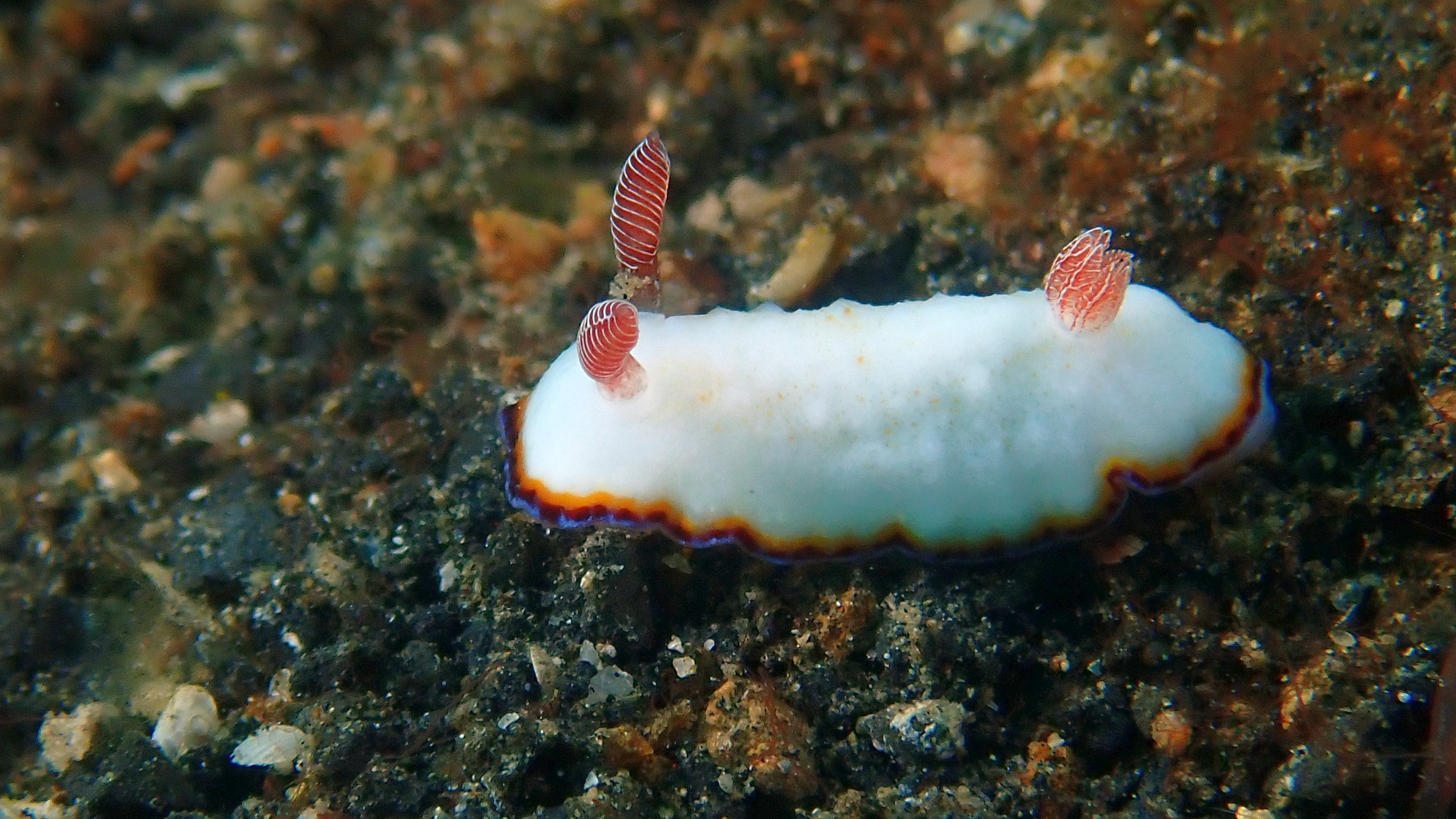 Ein besonderer Hingucker war eine Imperatorgarnele, die wie ein winziger Jockey auf einer Schnecke „ritt“. Zum Schluss tauchte sogar eine Flamboyant-Sepia auf. Leider war genau in diesem Moment der Akku meiner Kamera fast leer, sodass ich nur noch Fotos machen, aber keinen Film mehr aufnehmen konnte.