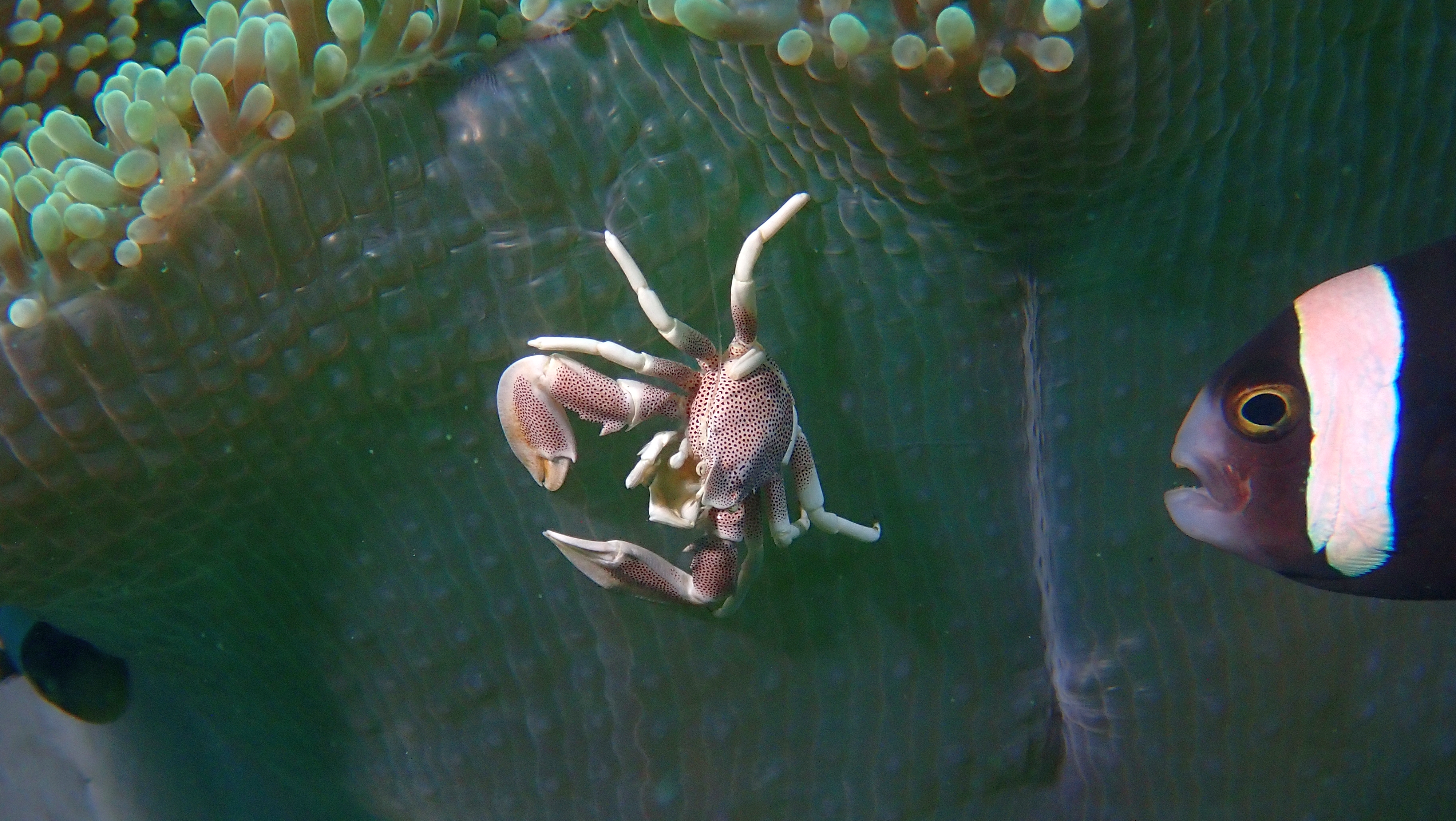 An unserem finalen Tauchtag wurden wir noch einmal mit großartigen Sichtungen belohnt. Wir entdeckten sowohl einen kleinen roten als auch einen gelben Anglerfisch – letzterer öffnete sogar weit sein Maul. Ein Teufelsfisch „spazierte“ direkt an uns vorbei. Sehr schön anzusehen waren außerdem ein Porzellankrebs in einer Anemone und ein Geisterfetzenfisch.