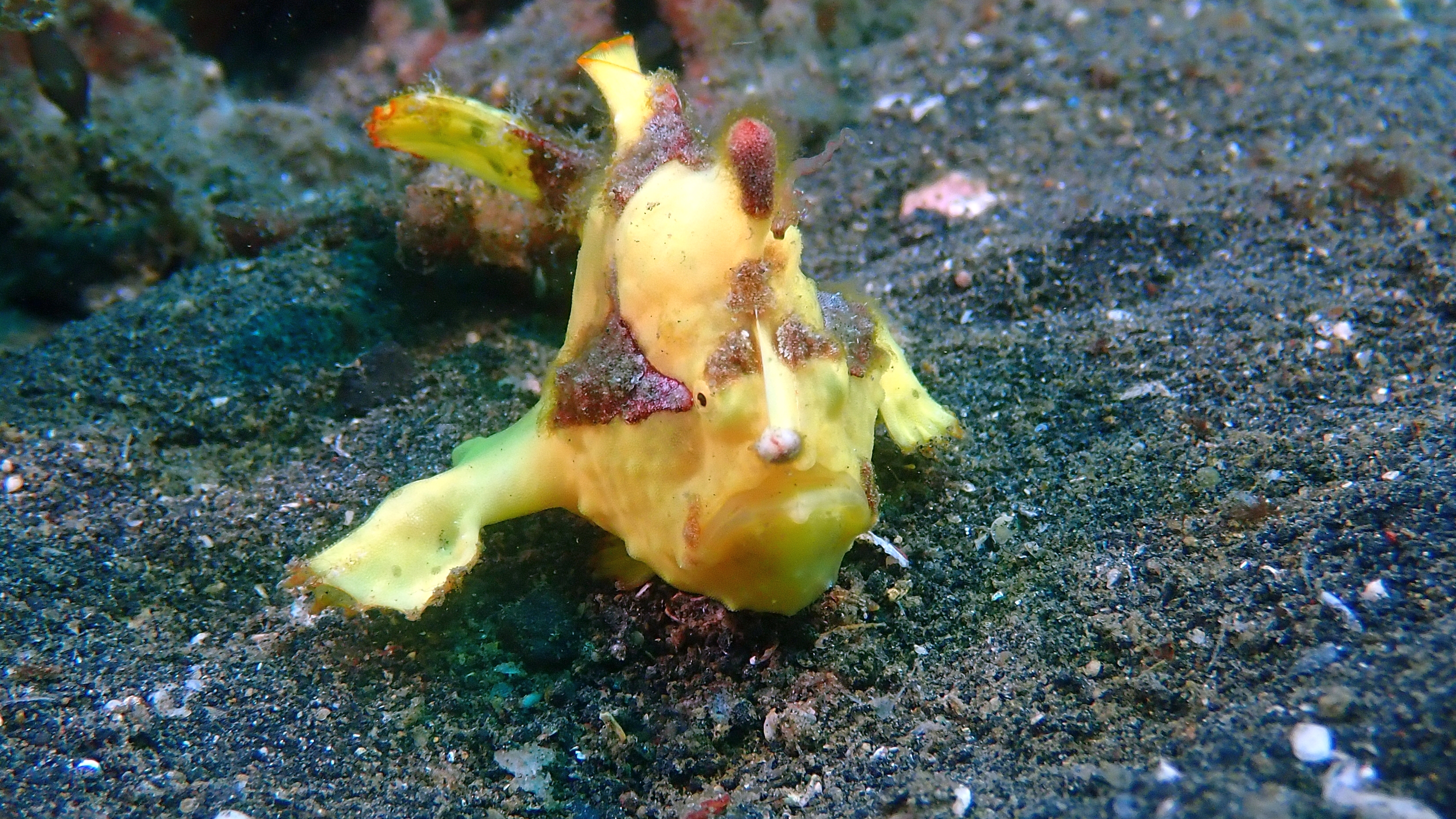 An unserem finalen Tauchtag wurden wir noch einmal mit großartigen Sichtungen belohnt. Wir entdeckten sowohl einen kleinen roten als auch einen gelben Anglerfisch – letzterer öffnete sogar weit sein Maul. Ein Teufelsfisch „spazierte“ direkt an uns vorbei. Sehr schön anzusehen waren außerdem ein Porzellankrebs in einer Anemone und ein Geisterfetzenfisch.