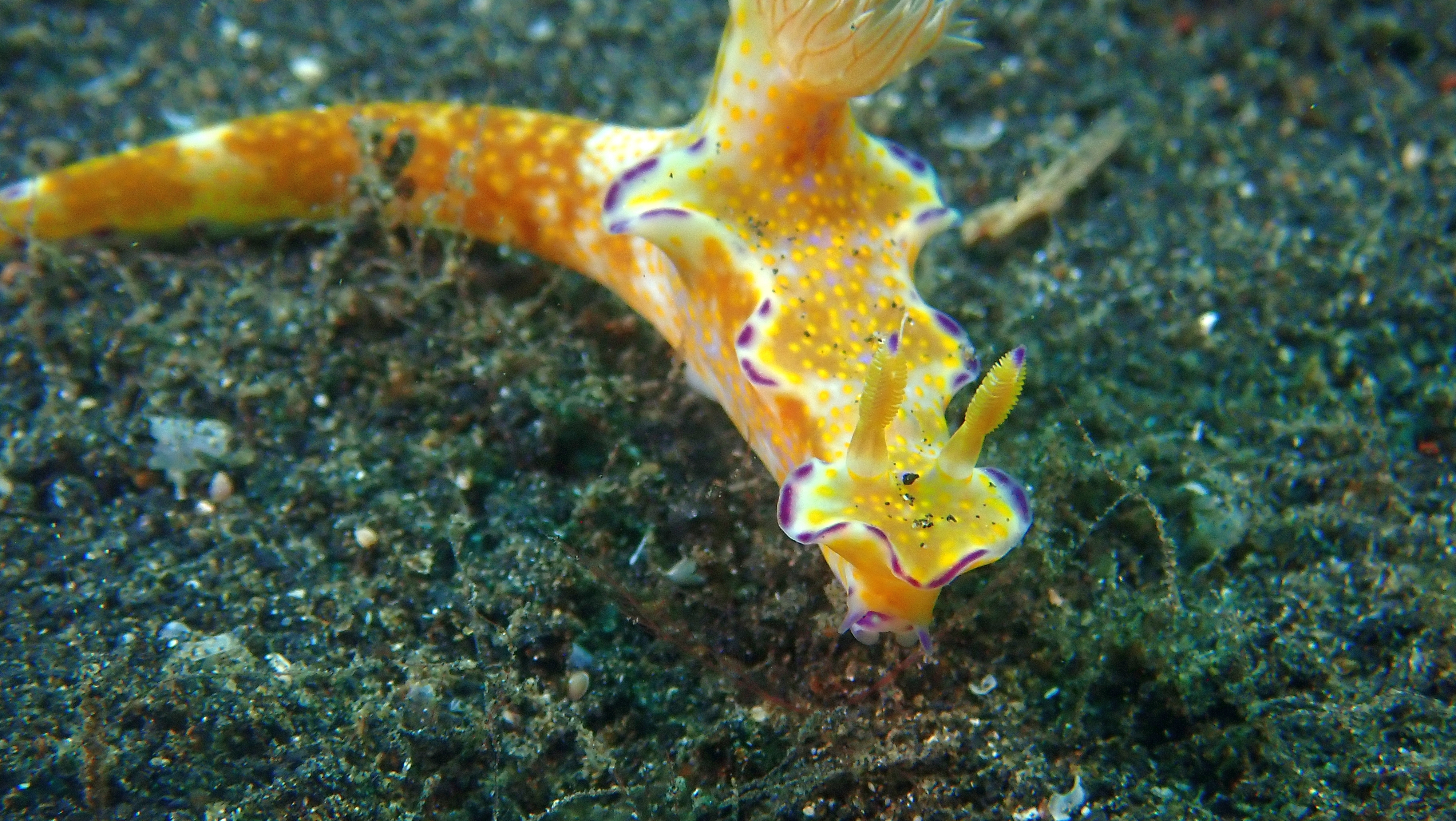 Ein besonderer Hingucker war eine Imperatorgarnele, die wie ein winziger Jockey auf einer Schnecke „ritt“. Zum Schluss tauchte sogar eine Flamboyant-Sepia auf. Leider war genau in diesem Moment der Akku meiner Kamera fast leer, sodass ich nur noch Fotos machen, aber keinen Film mehr aufnehmen konnte.