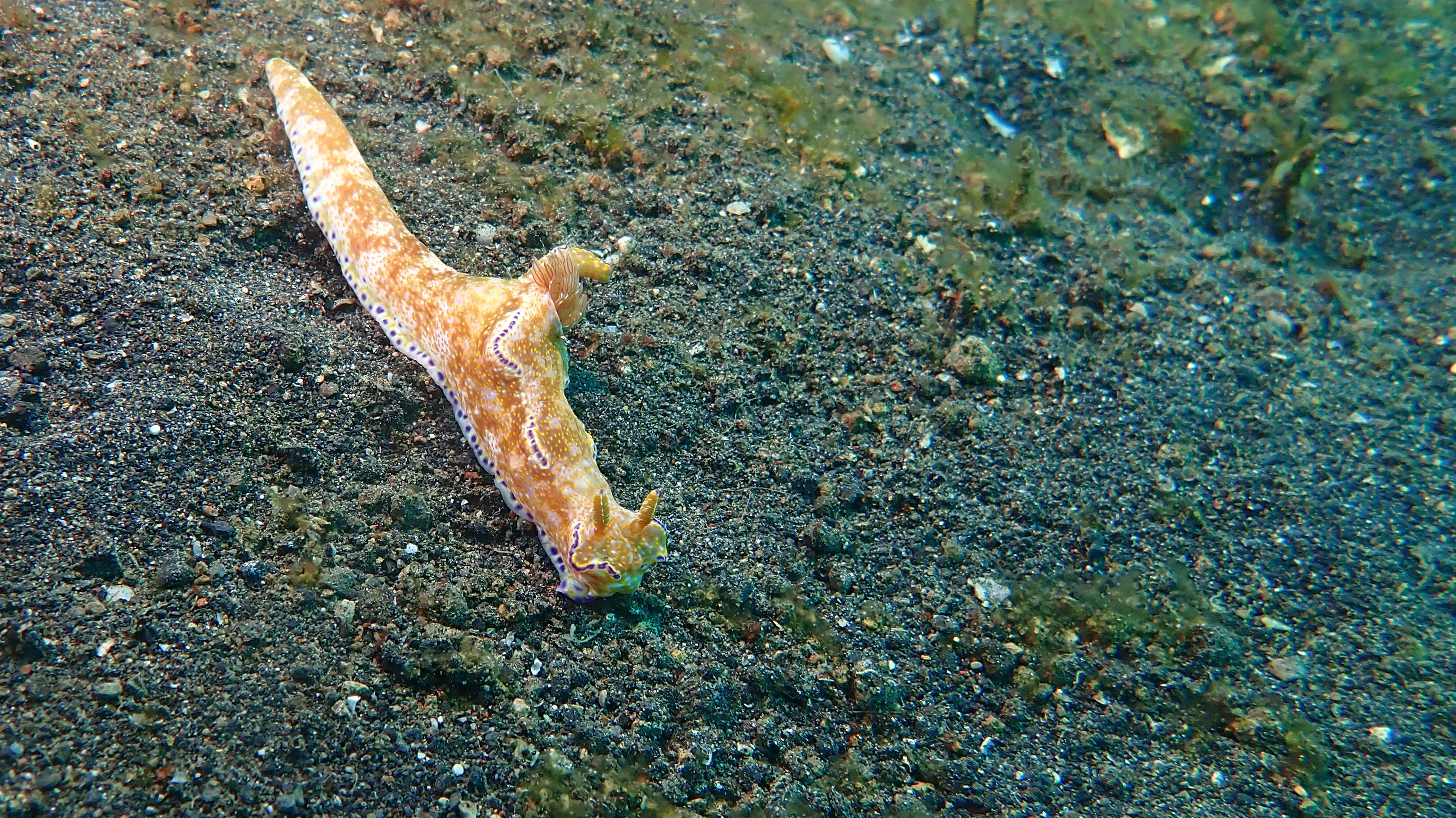 Ein besonderer Hingucker war eine Imperatorgarnele, die wie ein winziger Jockey auf einer Schnecke „ritt“. Zum Schluss tauchte sogar eine Flamboyant-Sepia auf. Leider war genau in diesem Moment der Akku meiner Kamera fast leer, sodass ich nur noch Fotos machen, aber keinen Film mehr aufnehmen konnte.