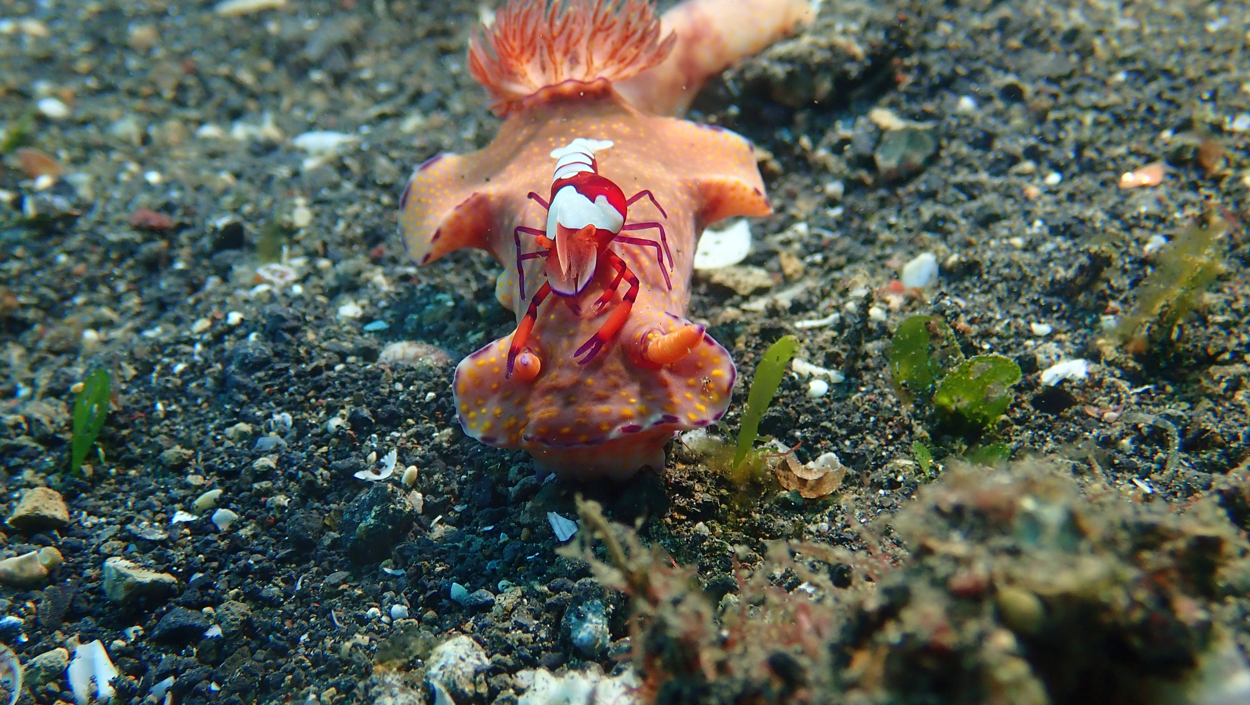 Ein besonderer Hingucker war eine Imperatorgarnele, die wie ein winziger Jockey auf einer Schnecke „ritt“. Zum Schluss tauchte sogar eine Flamboyant-Sepia auf. Leider war genau in diesem Moment der Akku meiner Kamera fast leer, sodass ich nur noch Fotos machen, aber keinen Film mehr aufnehmen konnte.
