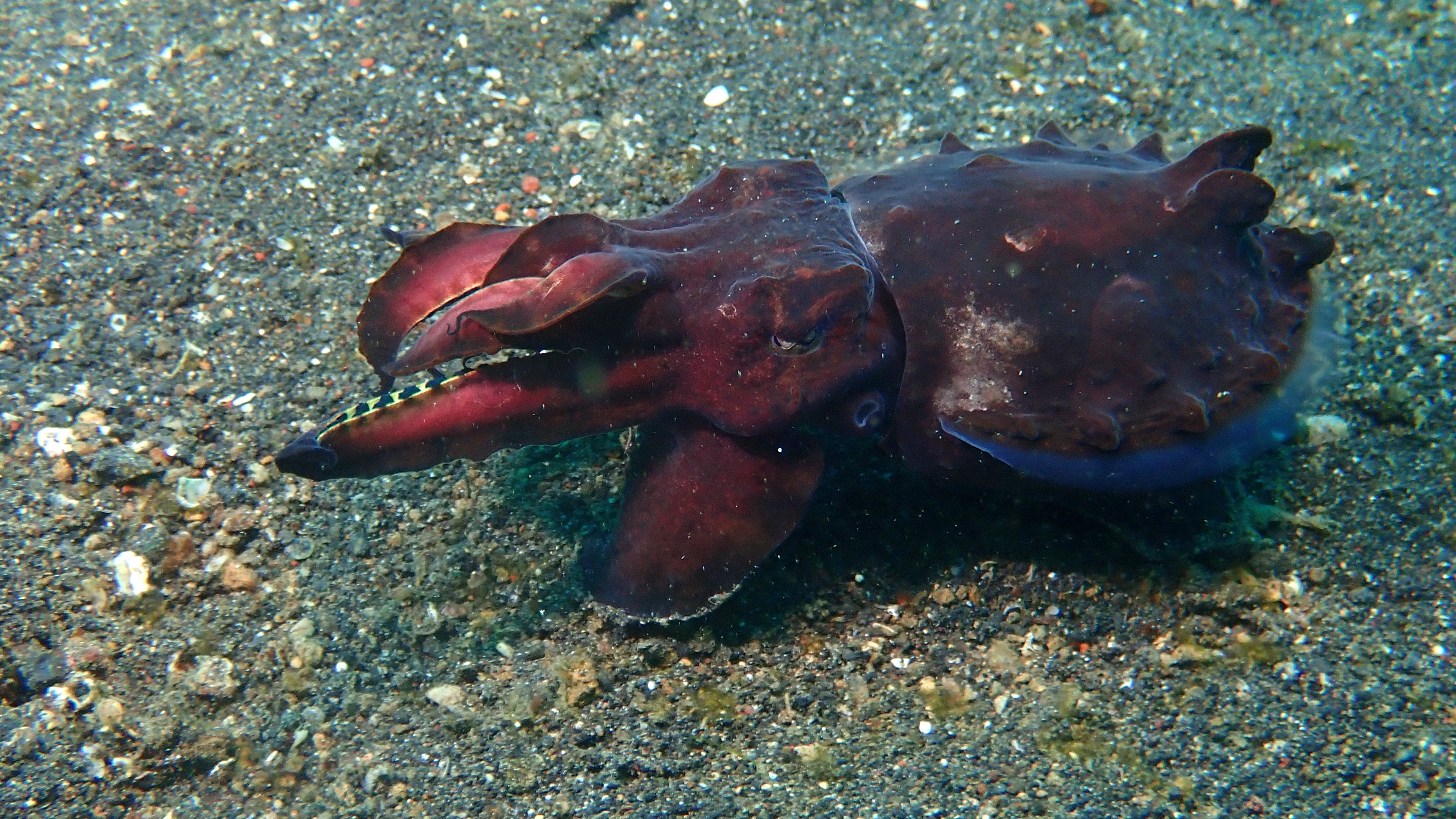 Ein besonderer Hingucker war eine Imperatorgarnele, die wie ein winziger Jockey auf einer Schnecke „ritt“. Zum Schluss tauchte sogar eine Flamboyant-Sepia auf. Leider war genau in diesem Moment der Akku meiner Kamera fast leer, sodass ich nur noch Fotos machen, aber keinen Film mehr aufnehmen konnte.