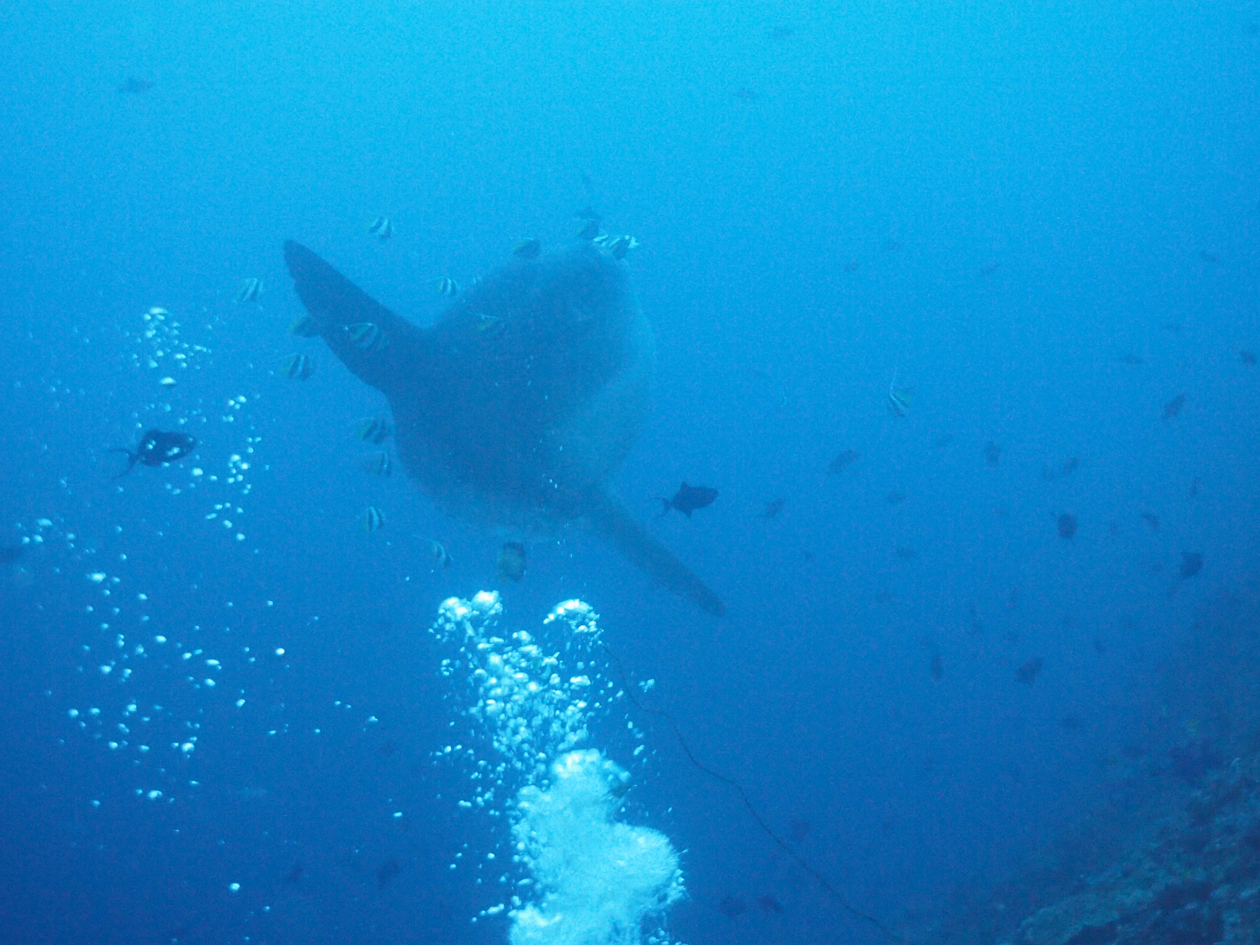 Heute Morgen durfte ich endlich Andrea zum Geburtstag gratulieren und sie hat ihren E-Book Reader bekommen. Wir sind nach dem Frühstück dann wieder zum Tauchen abgeholt worden. Diesmal kam Roger mit. Zuerst hat er uns zum New Manta Point gebracht wo wir dann auch 3 Mantas gesehen haben. Nach dem Mittagessen ging es dann zum Tauchplatz Crystal Bay. Wir konnten dort auf 20 m warten während Roger bei 40 m auf Mola suche ging. Nach einer Viertelstunde kam er dann zurück und hat weiter seitlich nochmal gesucht und tatsächlich dort war er dann. Wir konnten den Mondfisch knapp 10 Minuten lang beobachten und Bilder und kurze Videos drehen. Dann ist er mit ein paar schnellen Flossenschlägen davon. Wir waren überglücklich einen Mondfisch gesehen zu haben. Auf dem Rückweg sah ich dann noch einen zweiten im Blauwasser. Abends sind wir dann noch einmal ins Restaurant des ENA - Dive Center gefahren und haben uns über die tollen Erlebnisse unterhalten und mit Roger selbstgemachte Tauchbilder ausgetauscht.