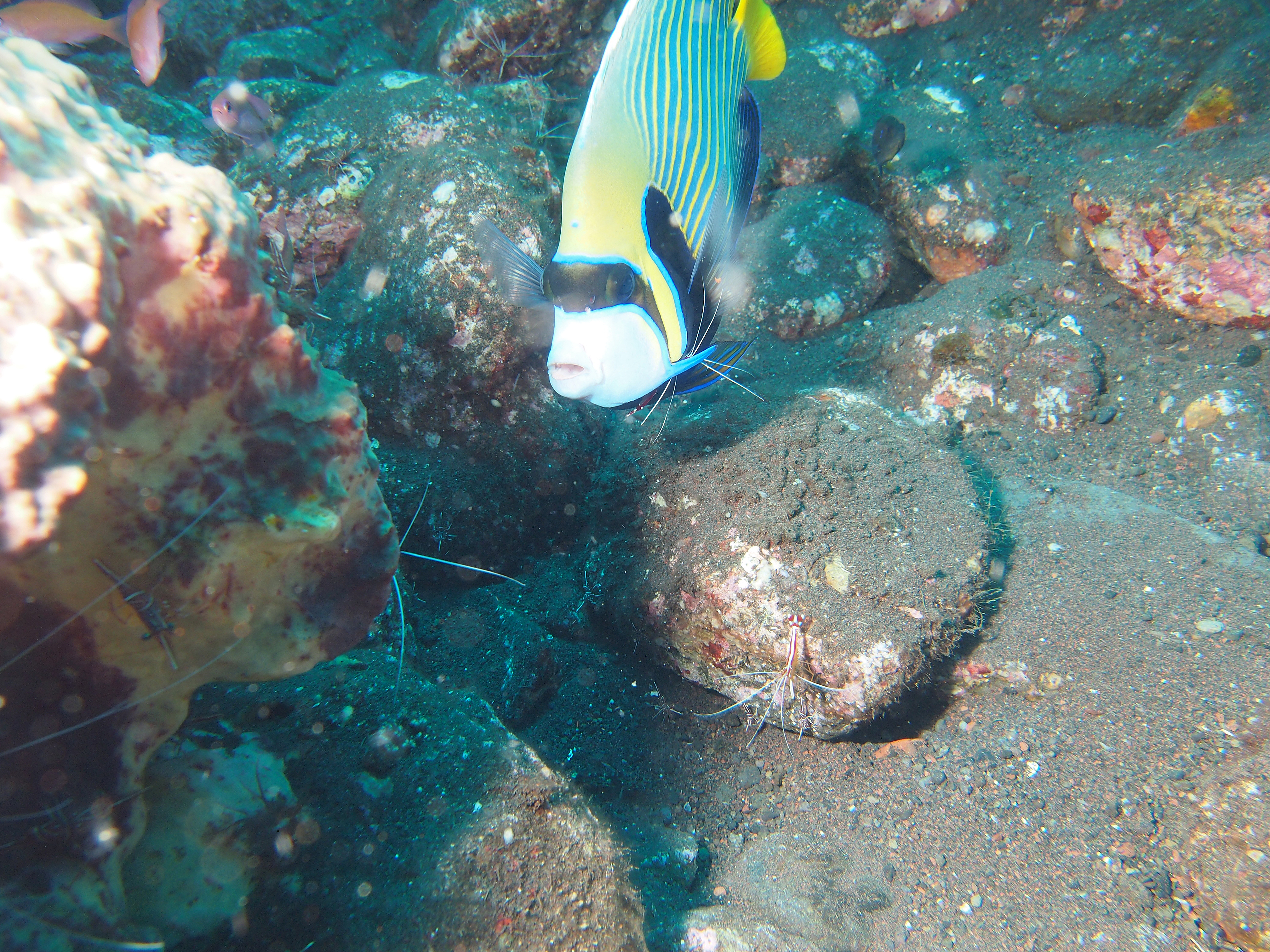An unserem letzten Tauchtag in Tulamben hatten wir uns vorgenommen 3-mal zu tauchen. Auf allen 3 TG gab es viel Makro zu sehen. Besonders gefallen hat uns der 3. TG an einem älteren Hotel welches wohl hauptsächlich von Guids benutzt wird. Wir sahen dort einen großen schwarzen Schaukelfisch, 4 Geisterfetzenfische einen Fangschreckenkrebs und 2 Putzerstationen mit vielen Garnelen. Es war zwar nicht besonders tief aber da es schon unser 3. TG war und man dauernd was neues entdeckte mussten wir doch sehr aufpassen nicht in die Deko zu kommen. Wir waren alle sehr begeistert und uns einig das dies einer der schönsten Tauchgänge war.
