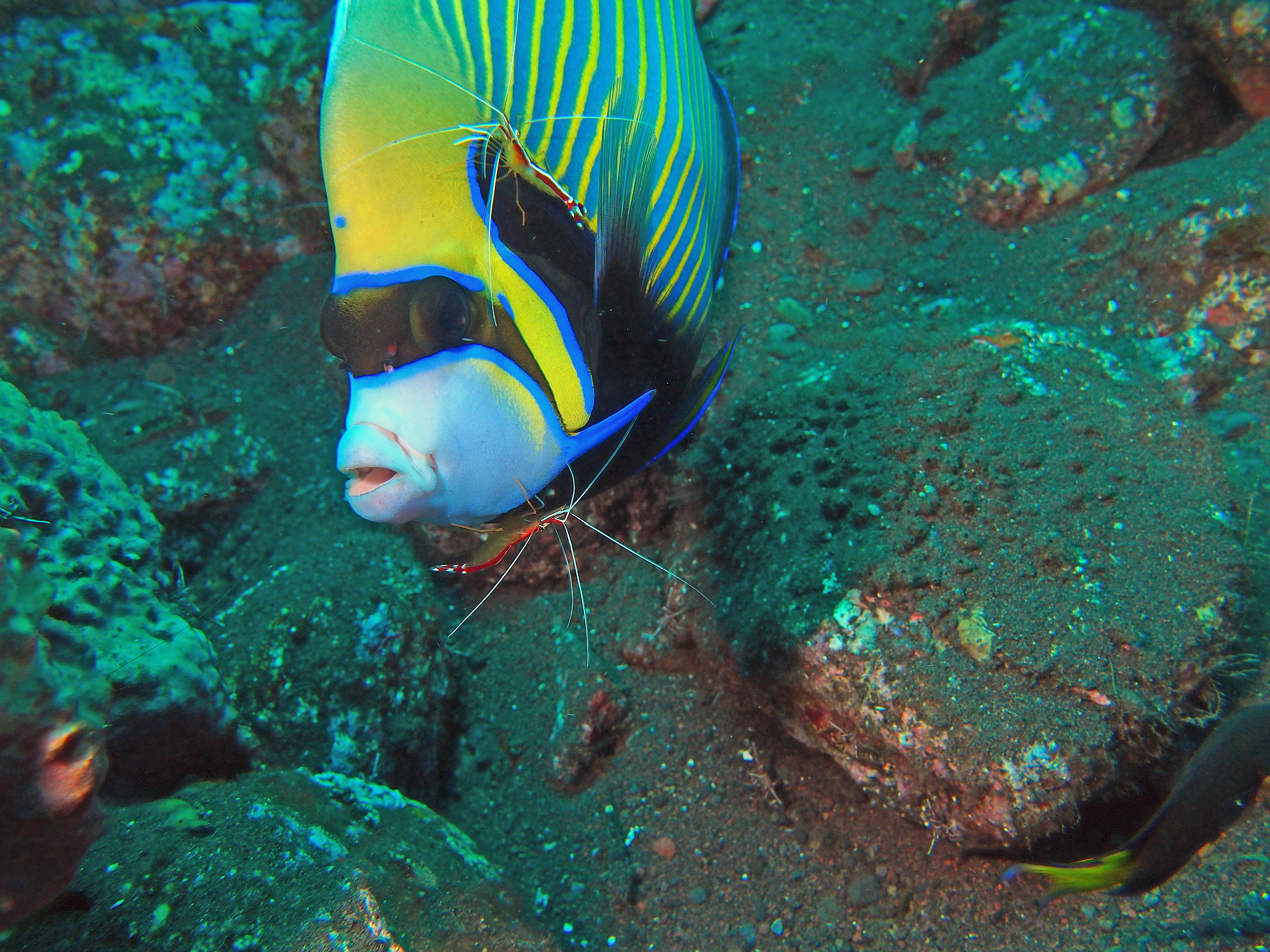 An unserem letzten Tauchtag in Tulamben hatten wir uns vorgenommen 3-mal zu tauchen. Auf allen 3 TG gab es viel Makro zu sehen. Besonders gefallen hat uns der 3. TG an einem älteren Hotel welches wohl hauptsächlich von Guids benutzt wird. Wir sahen dort einen großen schwarzen Schaukelfisch, 4 Geisterfetzenfische einen Fangschreckenkrebs und 2 Putzerstationen mit vielen Garnelen. Es war zwar nicht besonders tief aber da es schon unser 3. TG war und man dauernd was neues entdeckte mussten wir doch sehr aufpassen nicht in die Deko zu kommen. Wir waren alle sehr begeistert und uns einig das dies einer der schönsten Tauchgänge war.