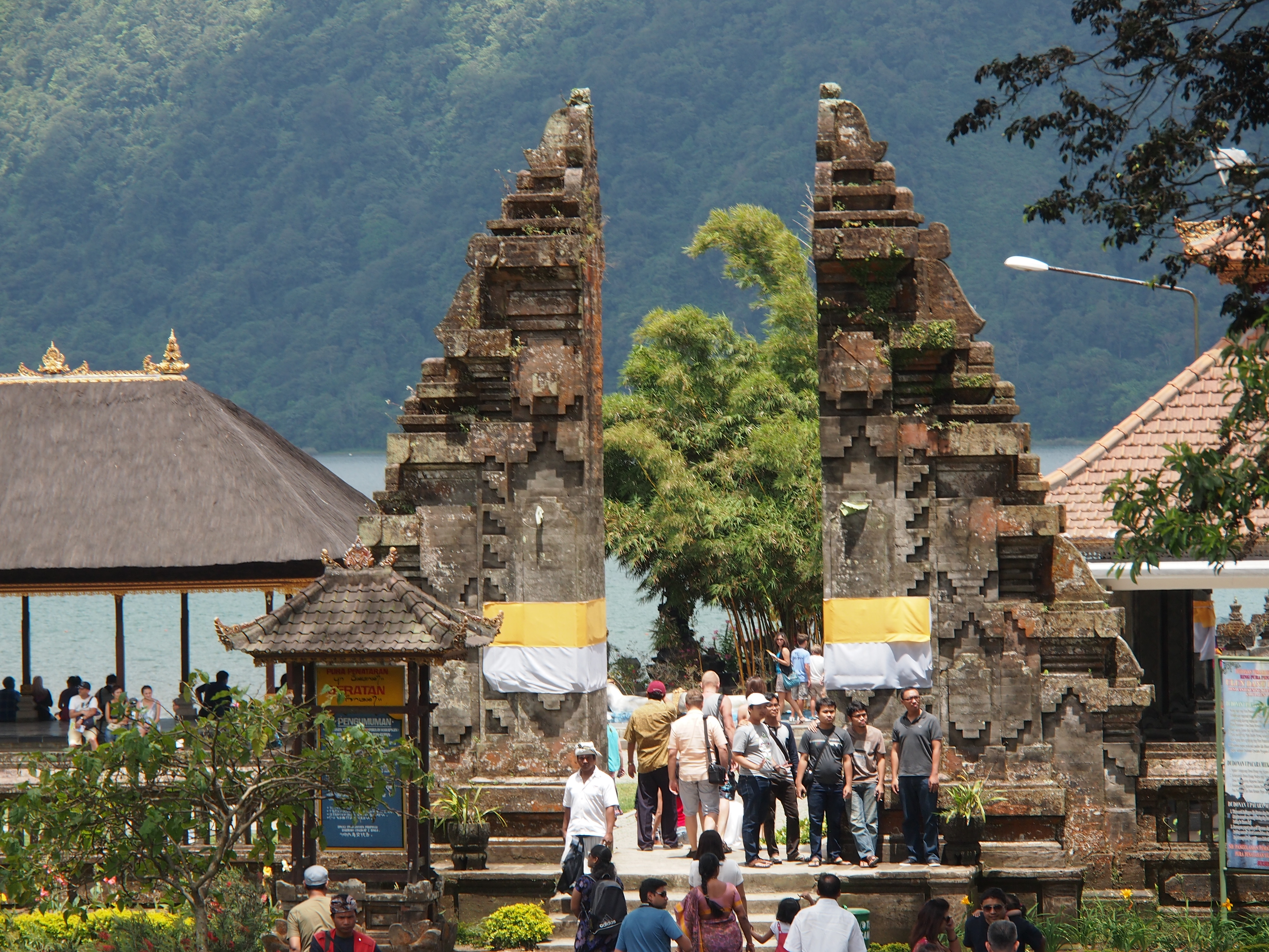 Weiter ging die Fahrt dann in die Berge. Unterwegs gab es von einem Aussichtspunkt einen tollen Blick auf die beiden Zwillingsseen. Der nächste Punkt auf unserem Programm war dann der Danu Beratan Tempel. Ein Hinduistischen Tempel der aber zumindest im Außenbereich mehr nach Ausflugsziel für Familien aussieht. Gleich daneben war der tropische Markt auf dem viele Gewürze und tropischen Früchte angeboten wurden. Wir haben aber nur um ein paar gewürzte Erdnüsse und aus Süßkartoffeln gebacken Chips mit Palmzucker gefeilscht. Nach dem Mittagessen war unser letzter Programmpunkt der Taman Ayun Tempel welcher mit einem Wassergarten umgeben ist. Übernachtet haben wir im Adhi Cottage in Ubud. Vorher sind wir noch ein bisschen durch Ubud geschlendert und haben uns ein kleines Restaurant zum Abendessen gesucht.
