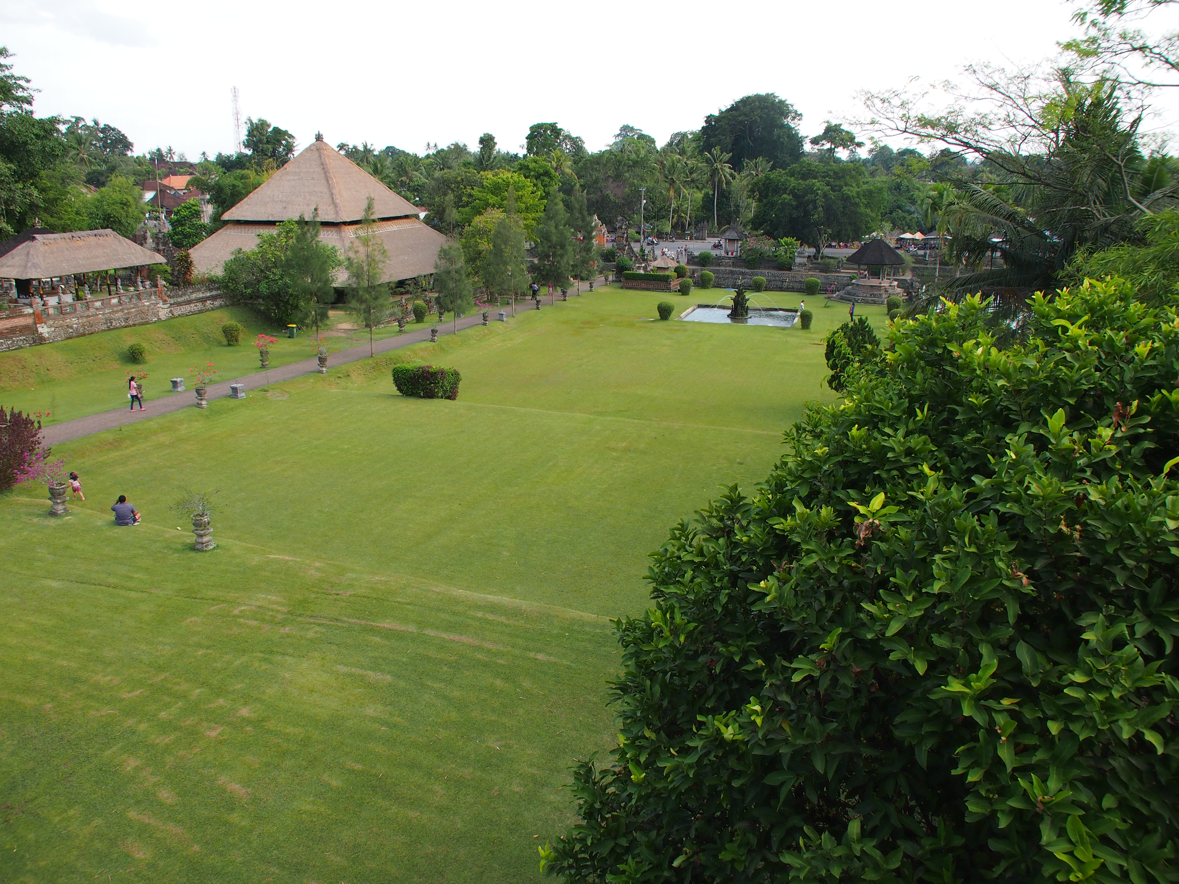 Weiter ging die Fahrt dann in die Berge. Unterwegs gab es von einem Aussichtspunkt einen tollen Blick auf die beiden Zwillingsseen. Der nächste Punkt auf unserem Programm war dann der Danu Beratan Tempel. Ein Hinduistischen Tempel der aber zumindest im Außenbereich mehr nach Ausflugsziel für Familien aussieht. Gleich daneben war der tropische Markt auf dem viele Gewürze und tropischen Früchte angeboten wurden. Wir haben aber nur um ein paar gewürzte Erdnüsse und aus Süßkartoffeln gebacken Chips mit Palmzucker gefeilscht. Nach dem Mittagessen war unser letzter Programmpunkt der Taman Ayun Tempel welcher mit einem Wassergarten umgeben ist. Übernachtet haben wir im Adhi Cottage in Ubud. Vorher sind wir noch ein bisschen durch Ubud geschlendert und haben uns ein kleines Restaurant zum Abendessen gesucht.