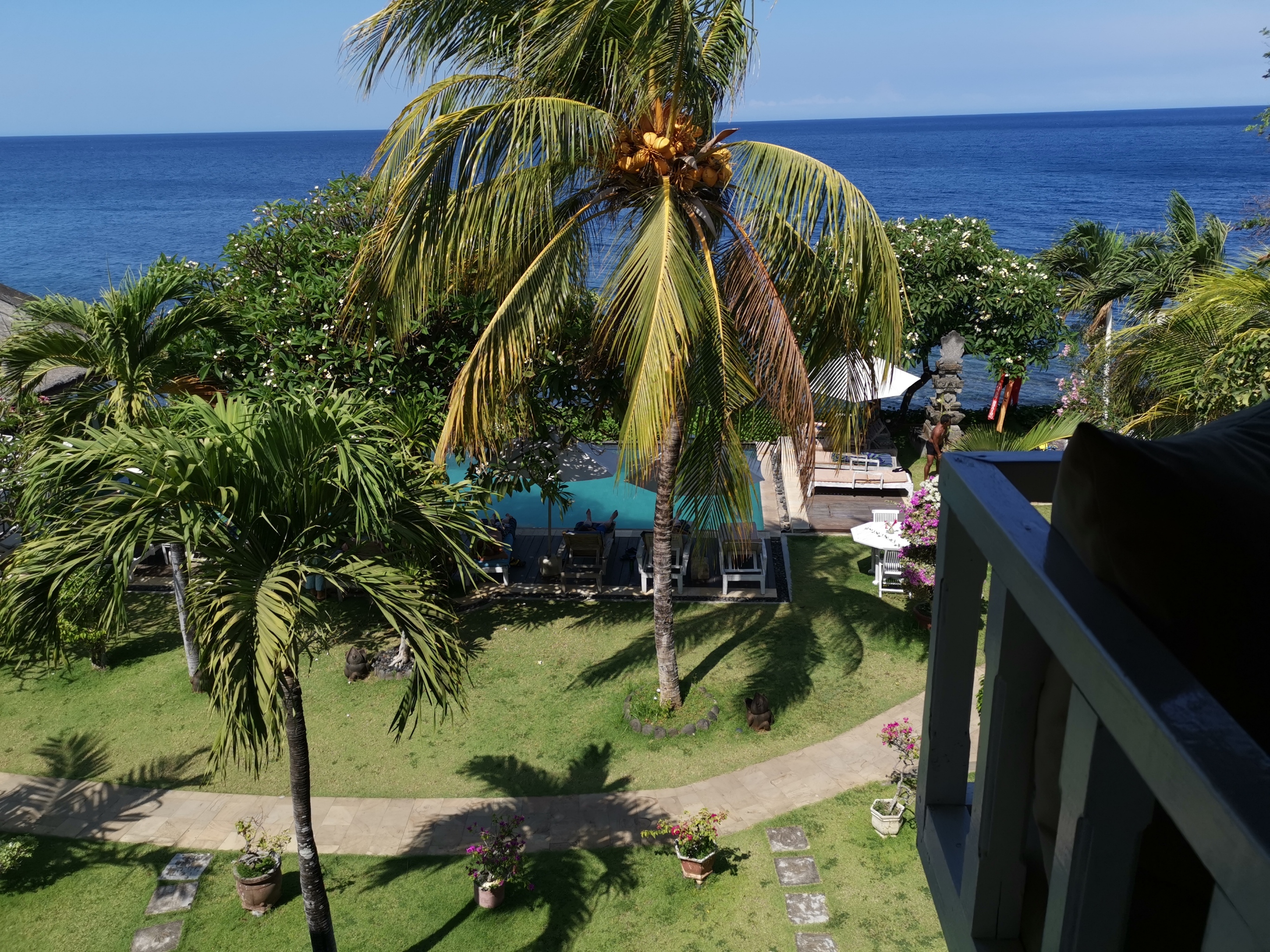 Wir sind heute kurz vor 11:00 Uhr zu unserem letzten Resort der Rundreise dem "Tauch Terminal Tulamben" aufgebrochen. Die Fahrt hat 3 anstrengende Stunden gedauert da unser Fahrer mit Höchstgeschwindigkeit aber einem Kleinbus welcher immer durchgeschlagen hat unterwegs war. Die Zimmer sind aber sehr schön mit Blick auf Meer und Pool. Anschließend haben wir uns noch zum Tauchen morgen um 08:00 Uhr angemeldet und gemütlich im Resort gegessen.
