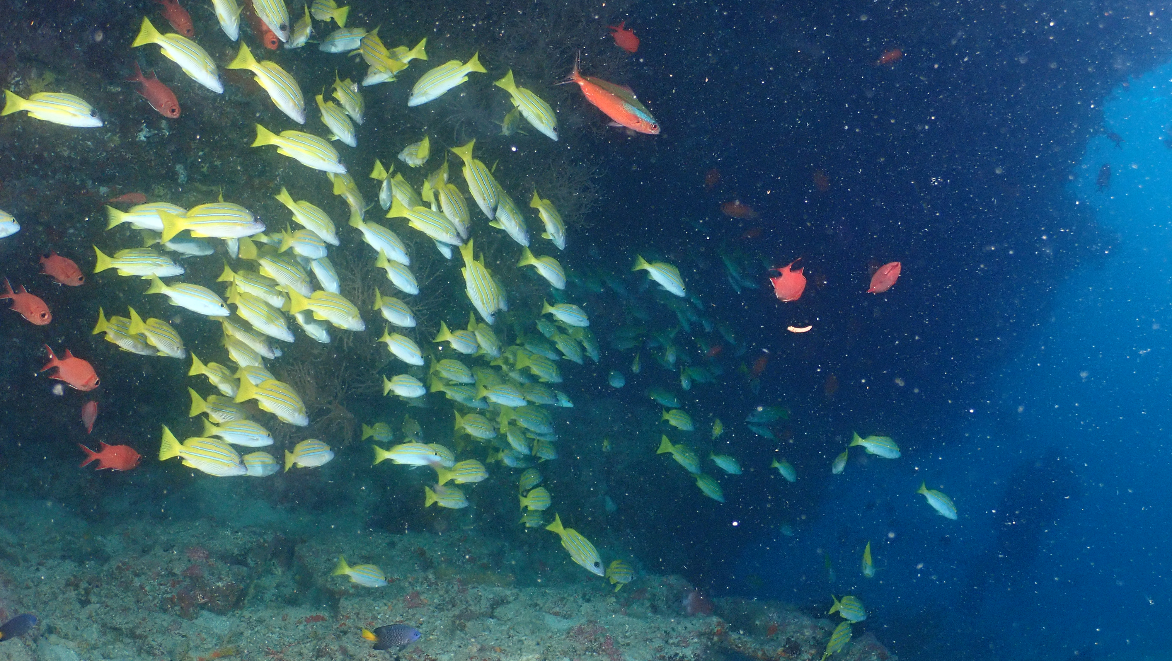 Am Vormittag war ich mit Peter am Fish Head wo wir sehr große Schwärme an Fischen und entsprechend viele Haie beobachten konnten. Nachmittags waren wir dann zu viert nur 5 Minuten entfernt am Bathala Thila wo das Riff noch deutlich besser ist.