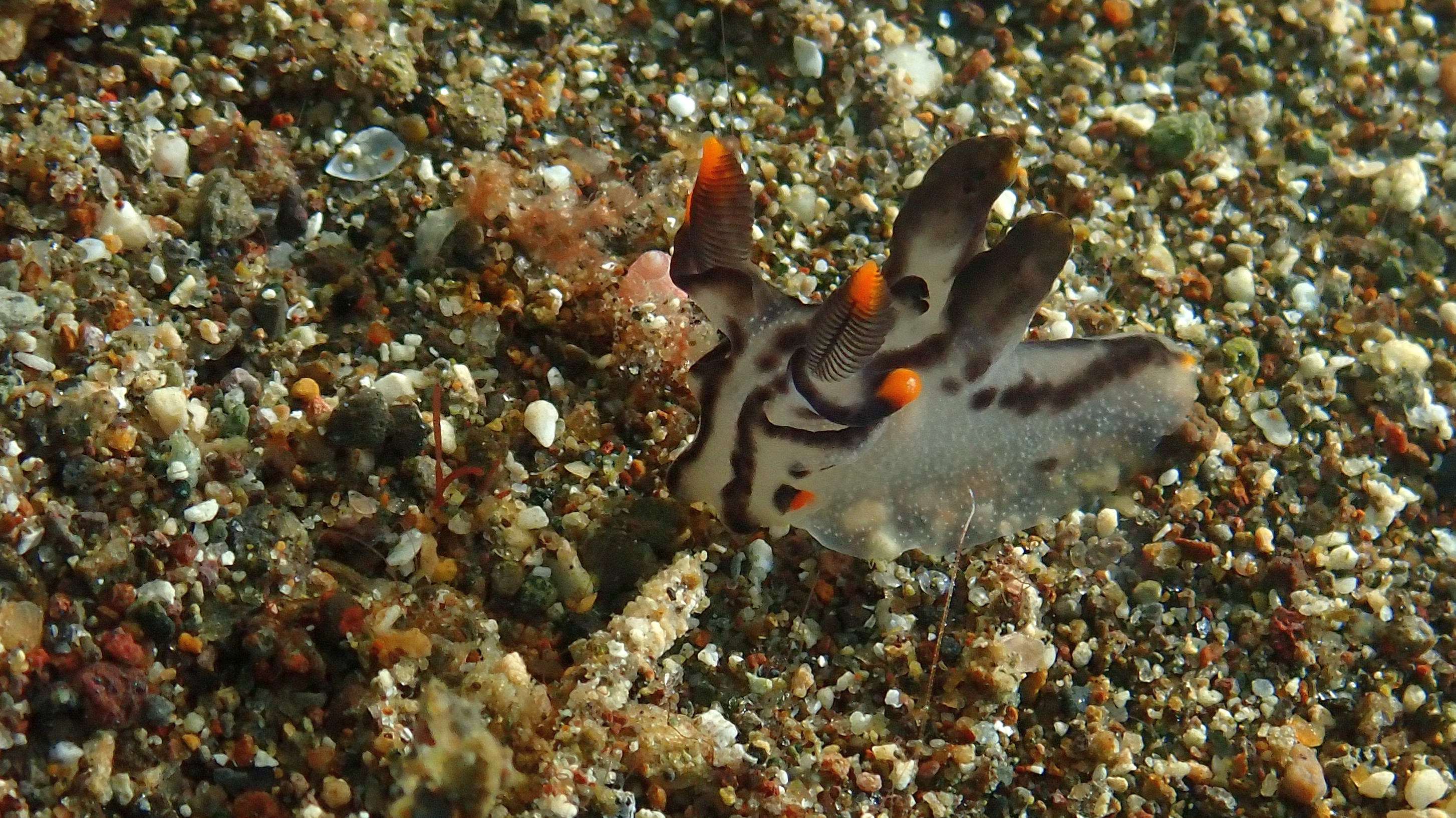 Heute haben wir 3 Tauchgänge unternommen. Der erste an einer Steilwand mit vielen Schnecken. Der zweite auf Sand war sehr schön. Unter anderen sahen wir einen Geisterpfeifenfisch, Seepferdchen und eine Flammenden Sepia. Der dritte war dann gleich vor dem Resort, mit dem Highlight eines haarigen Anglerfisches.
